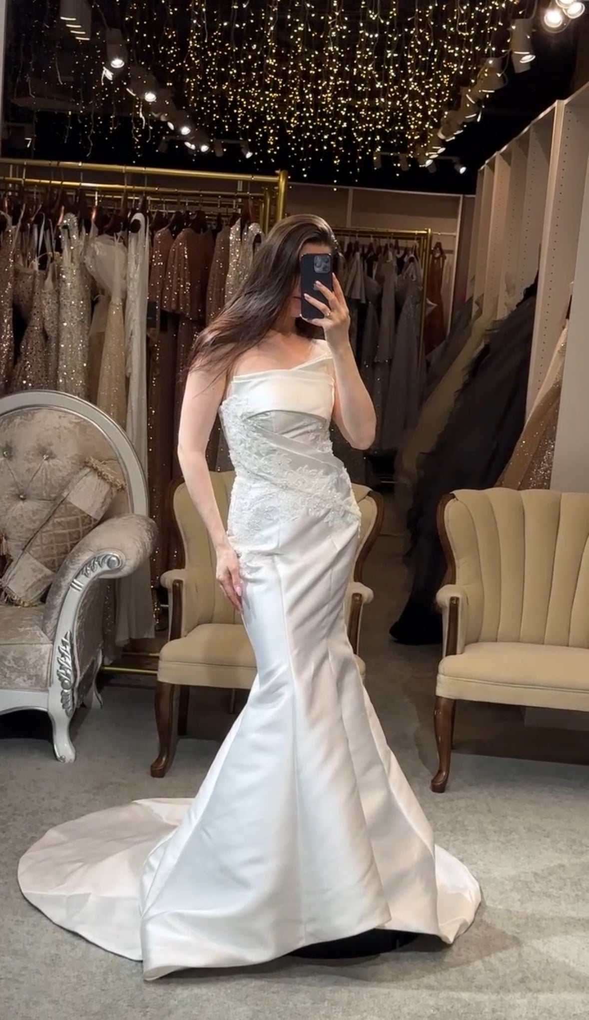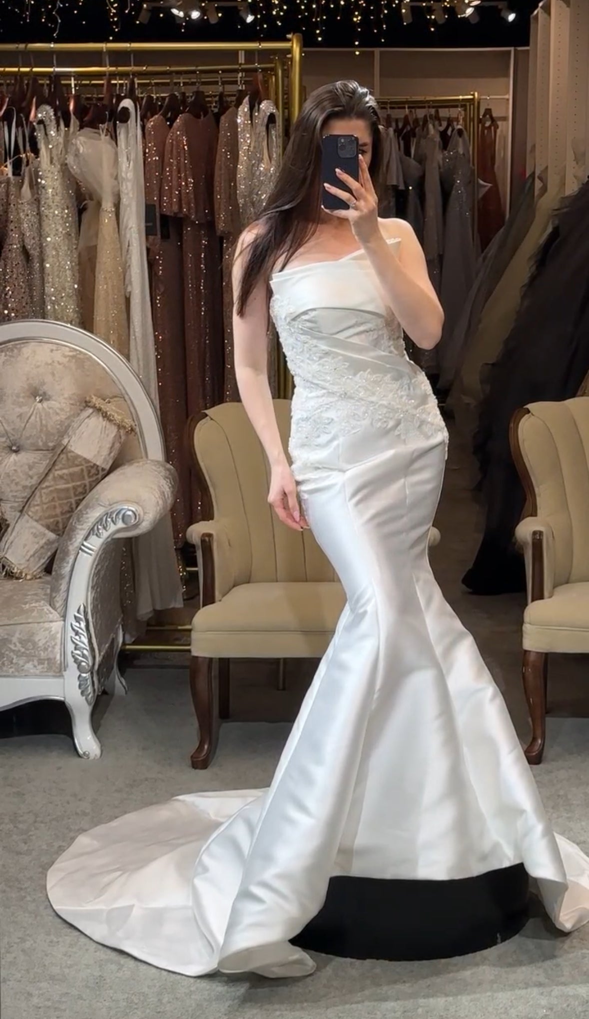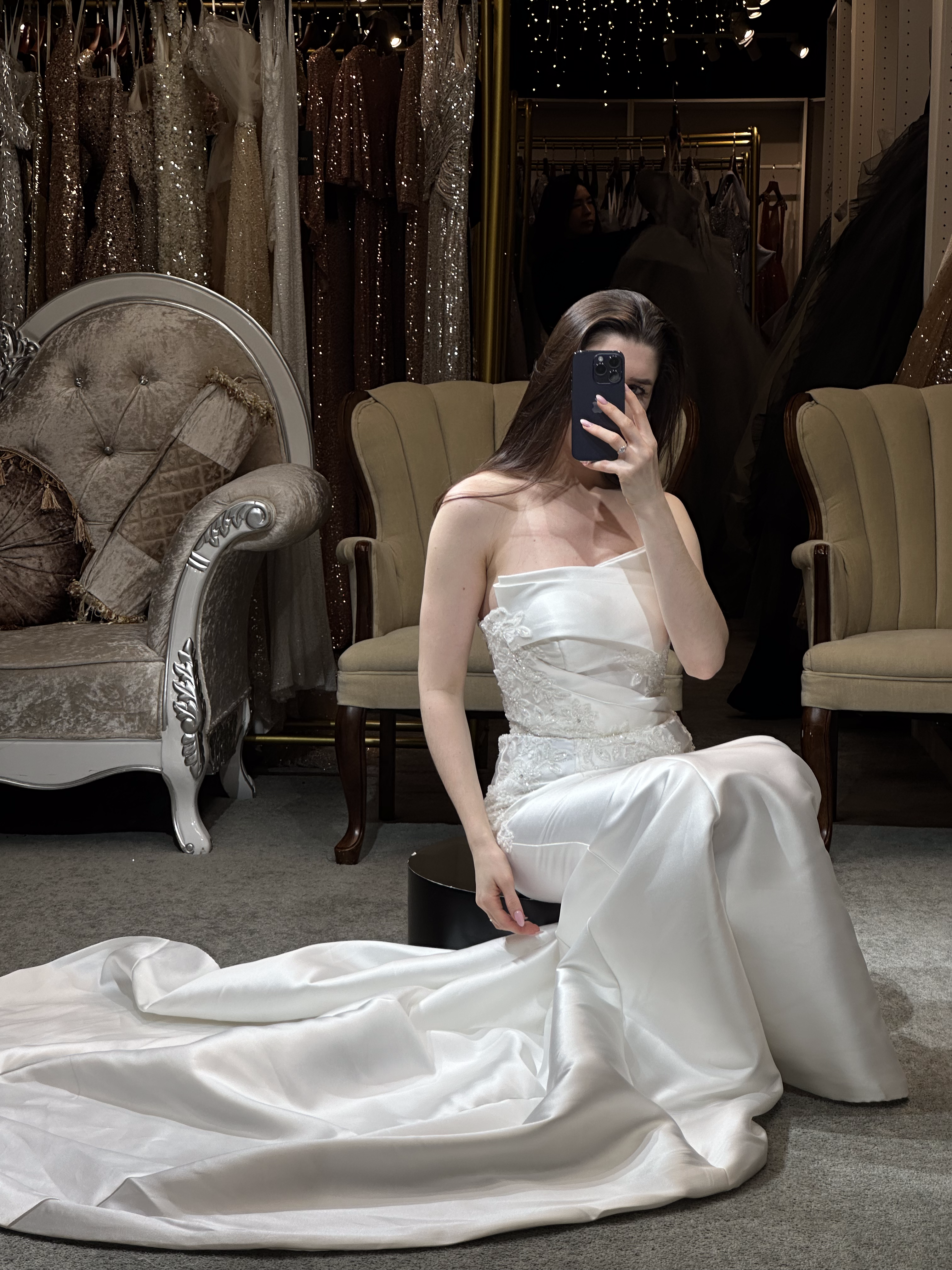 Step into a space designed for comfort and luxury. Our fitting rooms offer soft, cozy seating areas for you and your guests, along with an assortment of shoes to complement your dresses. Our curtains curate a private and safe environment, while our luxurious carpet and lighting ensure you feel pampered as you search for your dream gown. Book your appointment today and visit us to create a truly unforgettable experience.