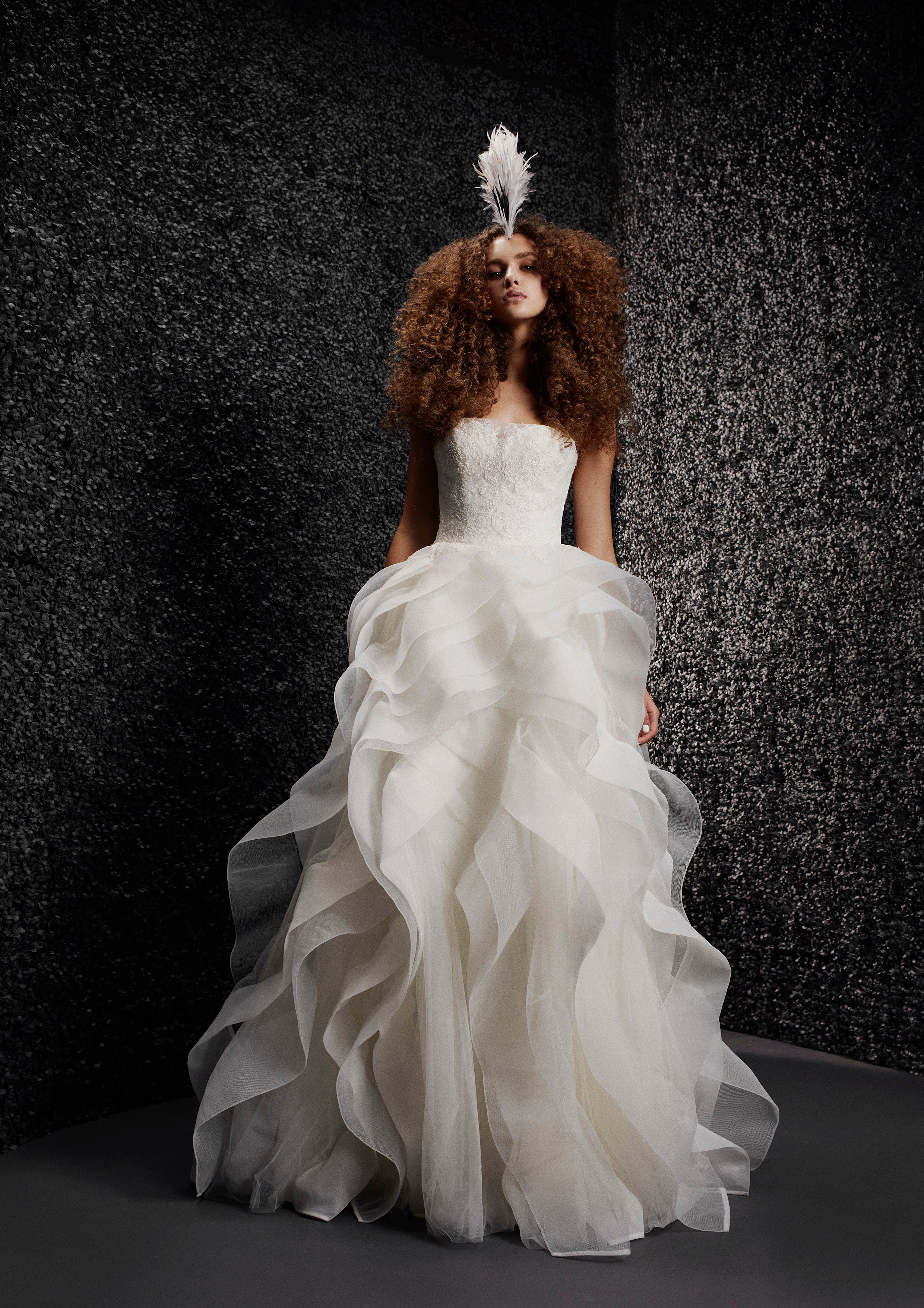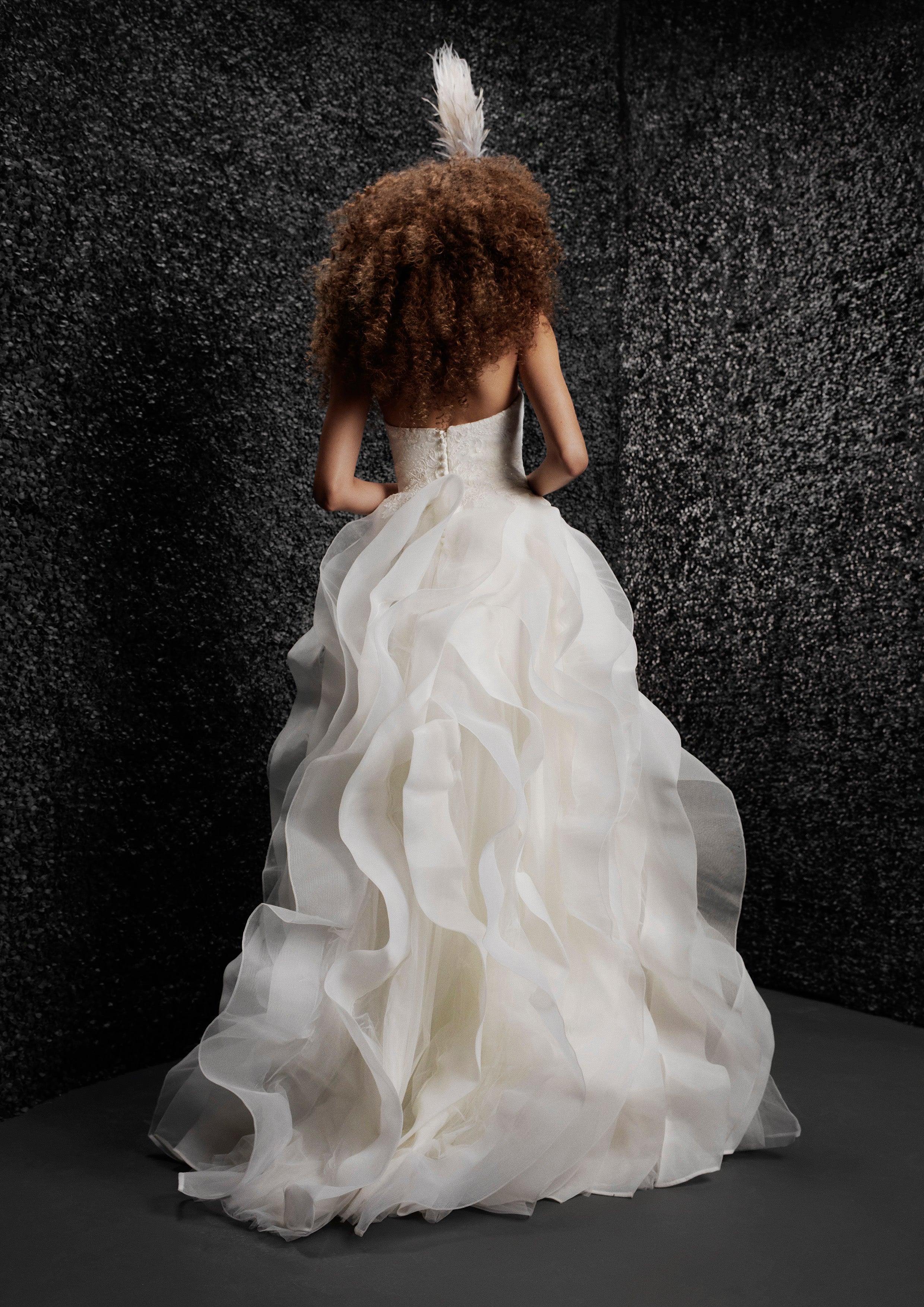 An innovative ball gown look in crisp organza and lace. Strapless corset bodice with row buttons at the back. The skirt unfolds in vertical layers rendered with a ruffled structure using horsehair bands.
