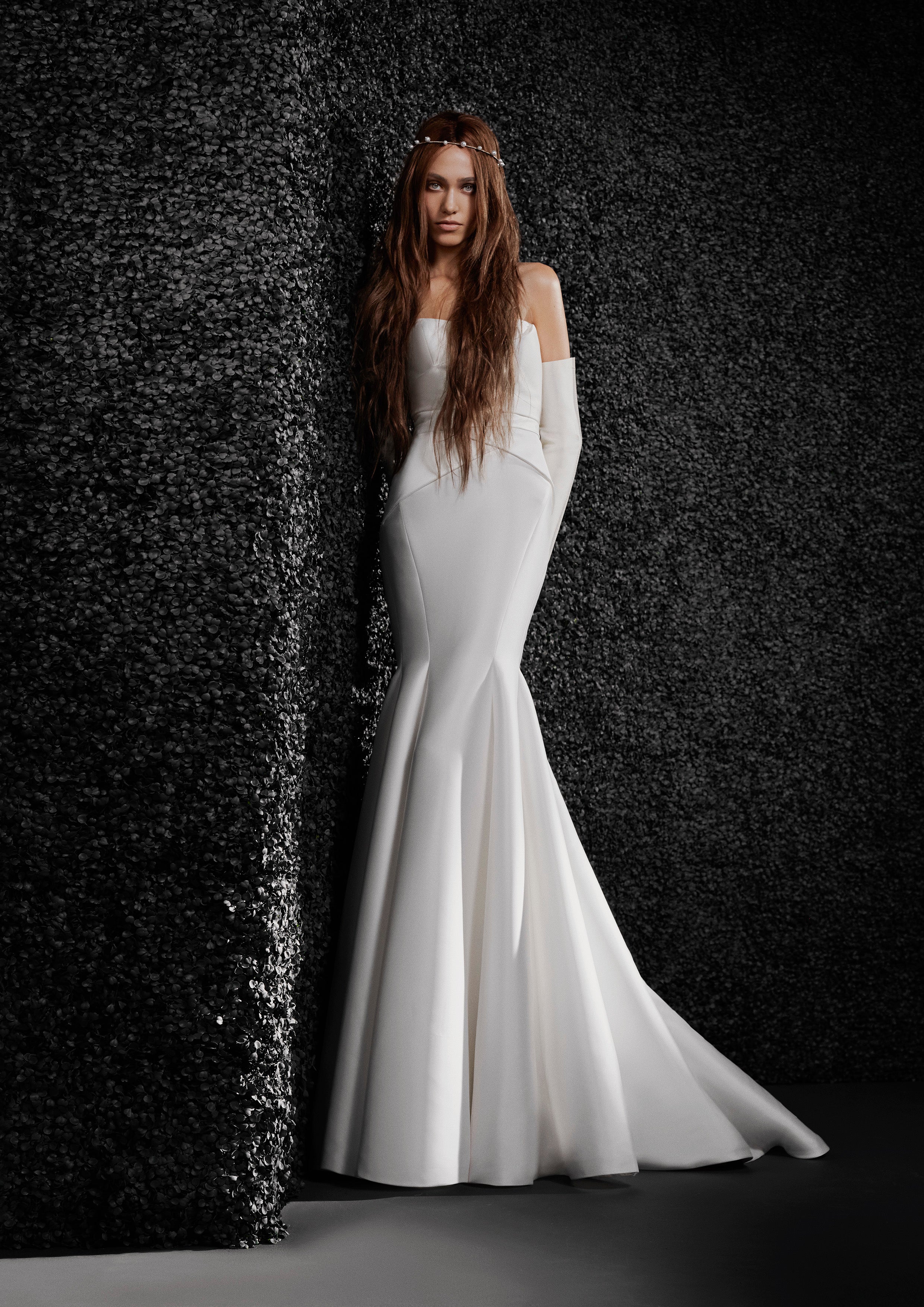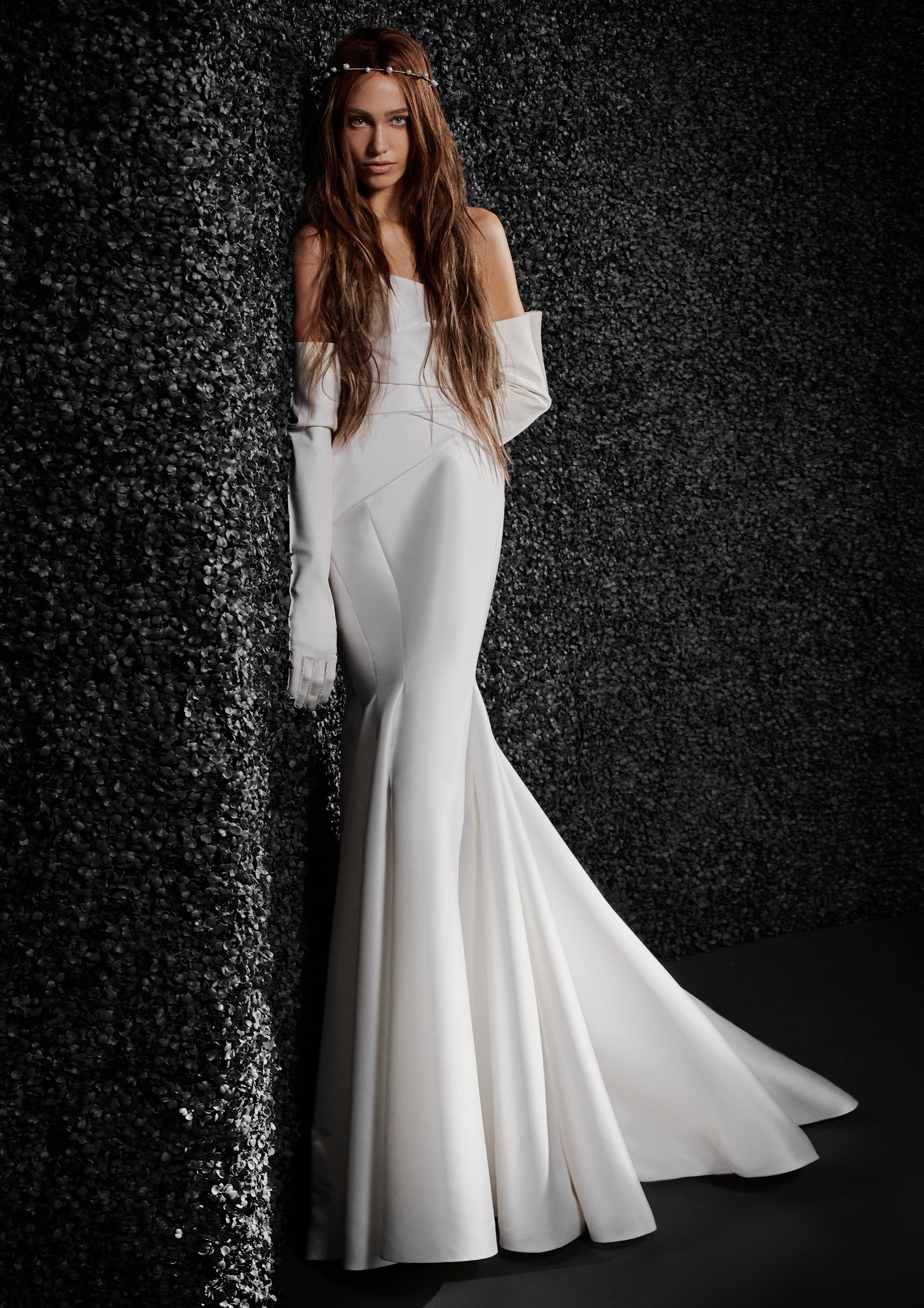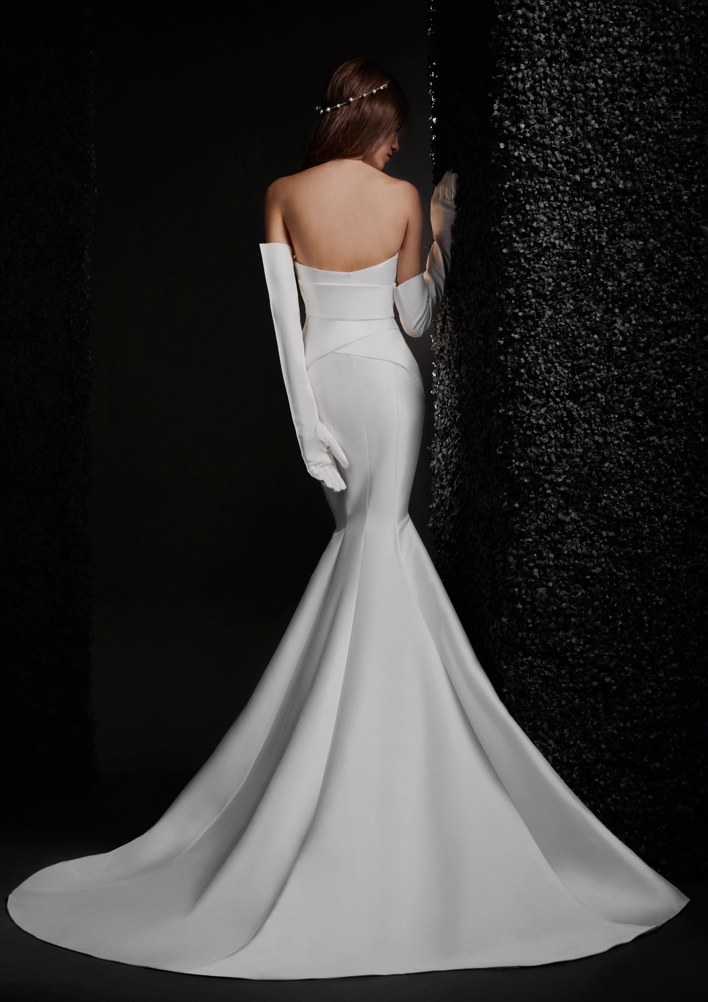 An architectural take on the mermaid gown. With a bustier bodice formed with wide pleats and folds, and sculptured fishtail skirt constructed with panels. Detachable glove sleeves. Also available in eco-friendly mikado.