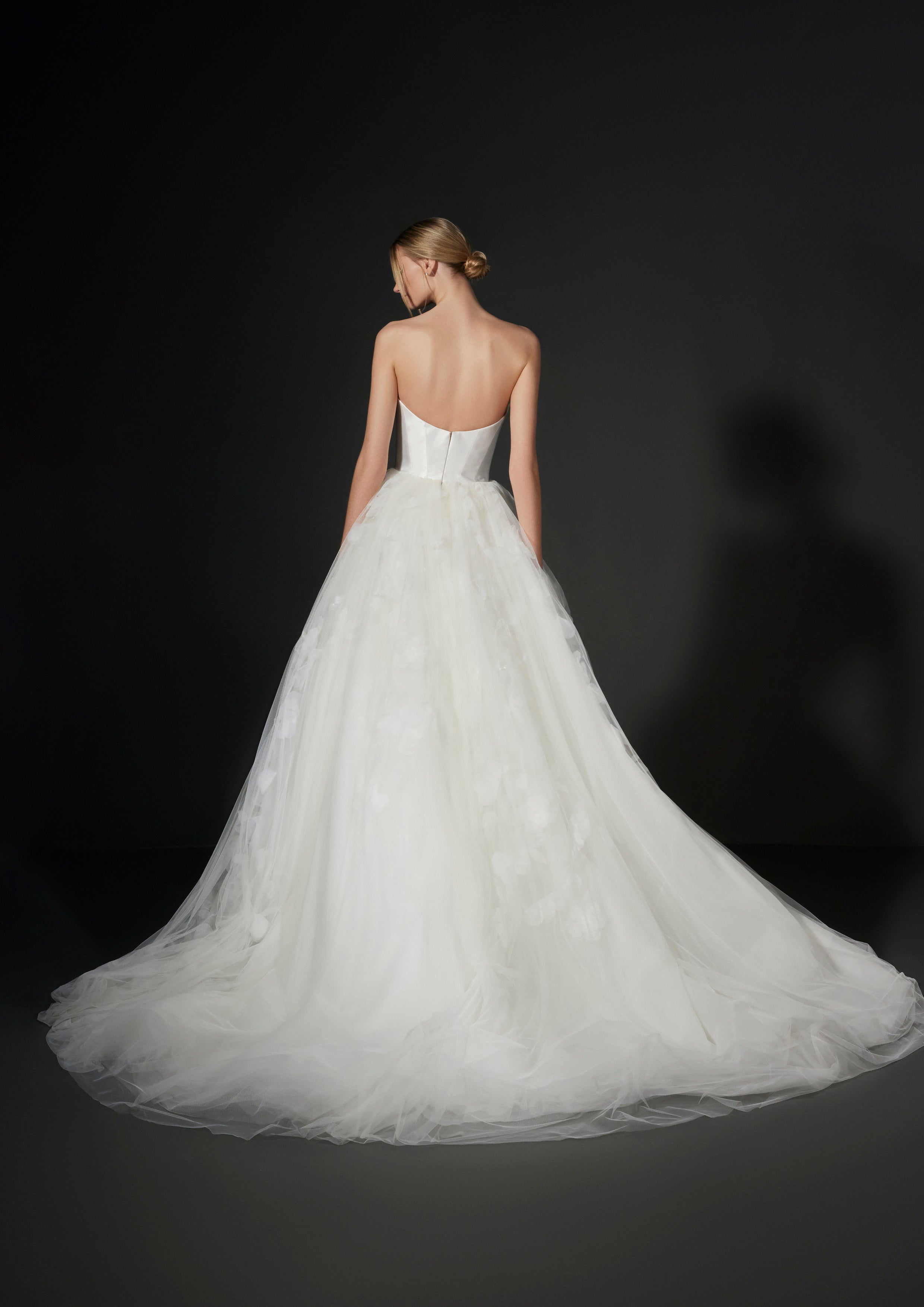 Surrender to the beauty of this princess-cut dress. It features a heart-shaped bodice made of mikado and a beautiful embroidered tulle skirt.