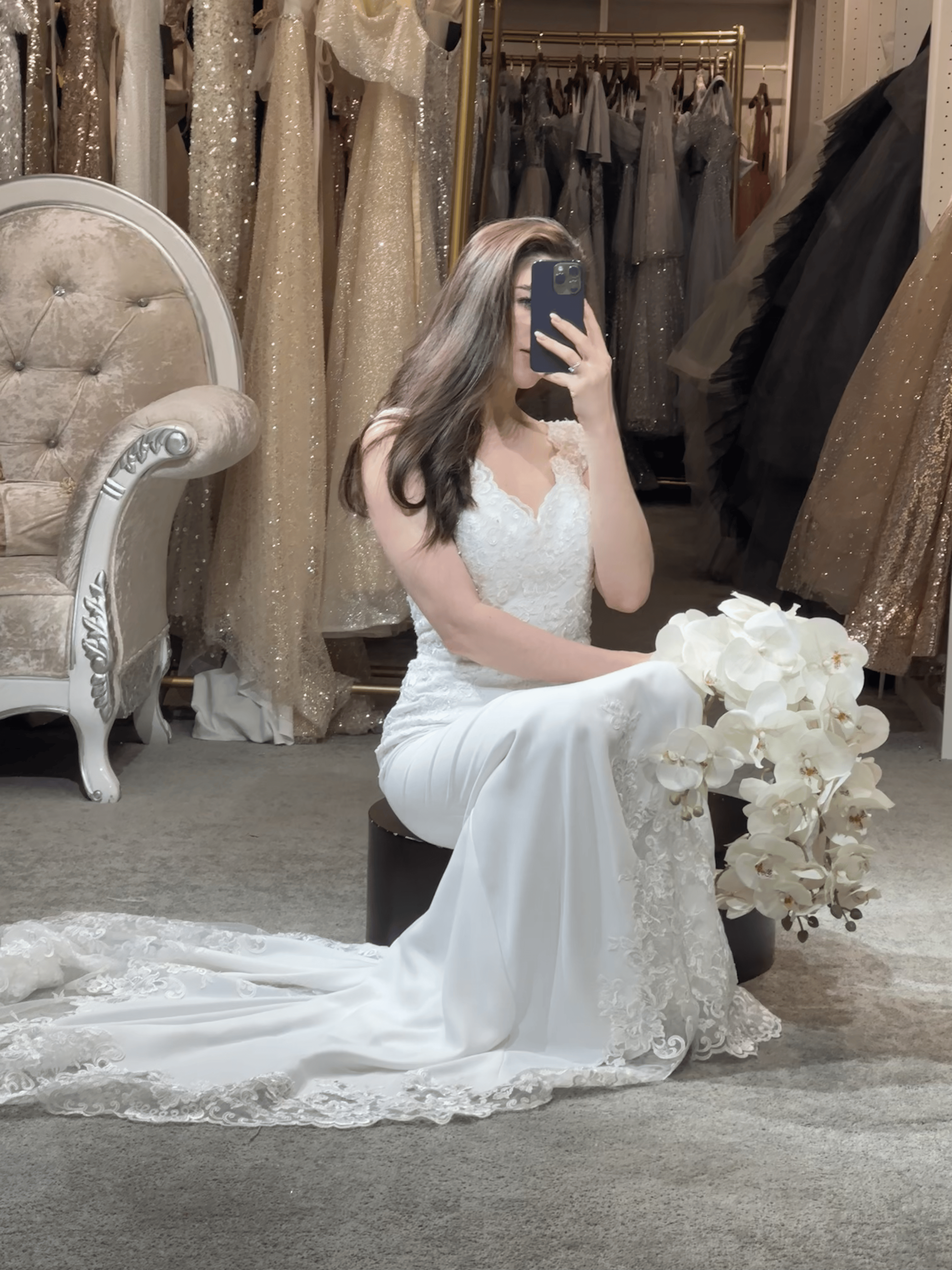 This stunning mermaid wedding dress combines elegance with intricate detail. The fitted silhouette hugs the body, highlighting the curves before gently flaring at the knees. The lace bodice adds a touch of romance and sophistication, while the matching lace train flows beautifully, echoing the delicate pattern from the bodice to create a harmonious, ethereal effect.