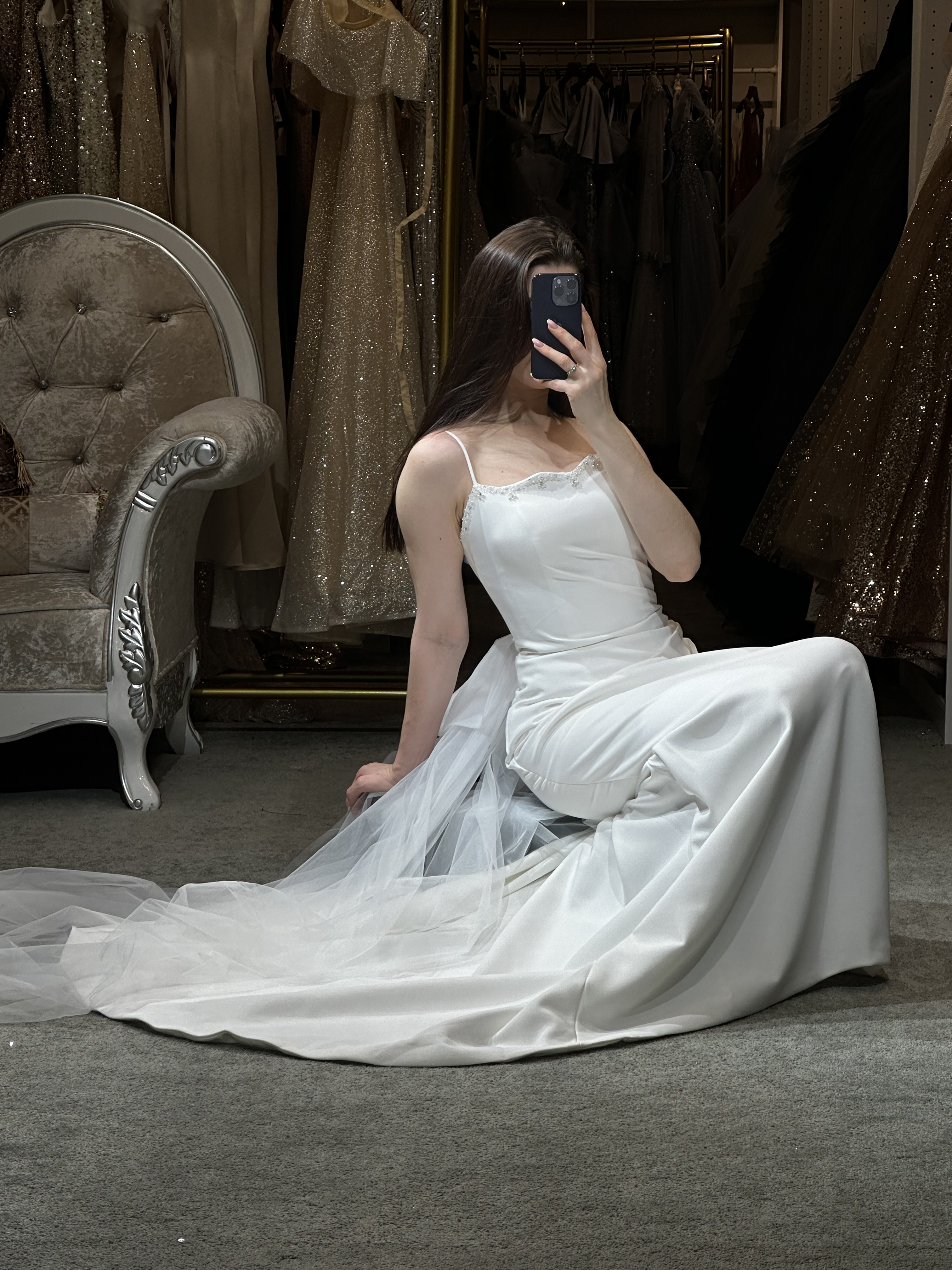 Step into a space designed for comfort and luxury. Our fitting rooms offer soft, cozy seating areas for you and your guests, along with an assortment of shoes to complement your dresses. Our curtains curate a private and safe environment, while our luxurious carpet and lighting ensure you feel pampered as you search for your dream gown. Book your appointment today and visit us to create a truly unforgettable experience.