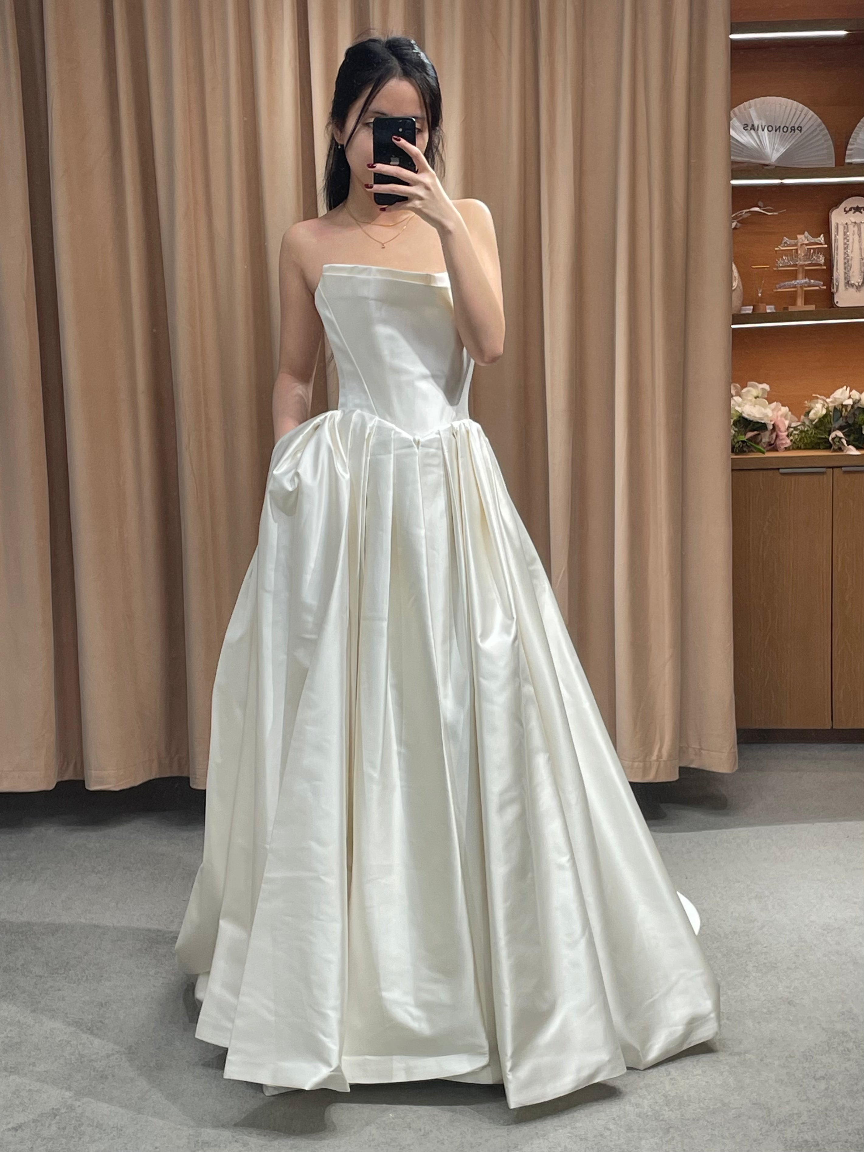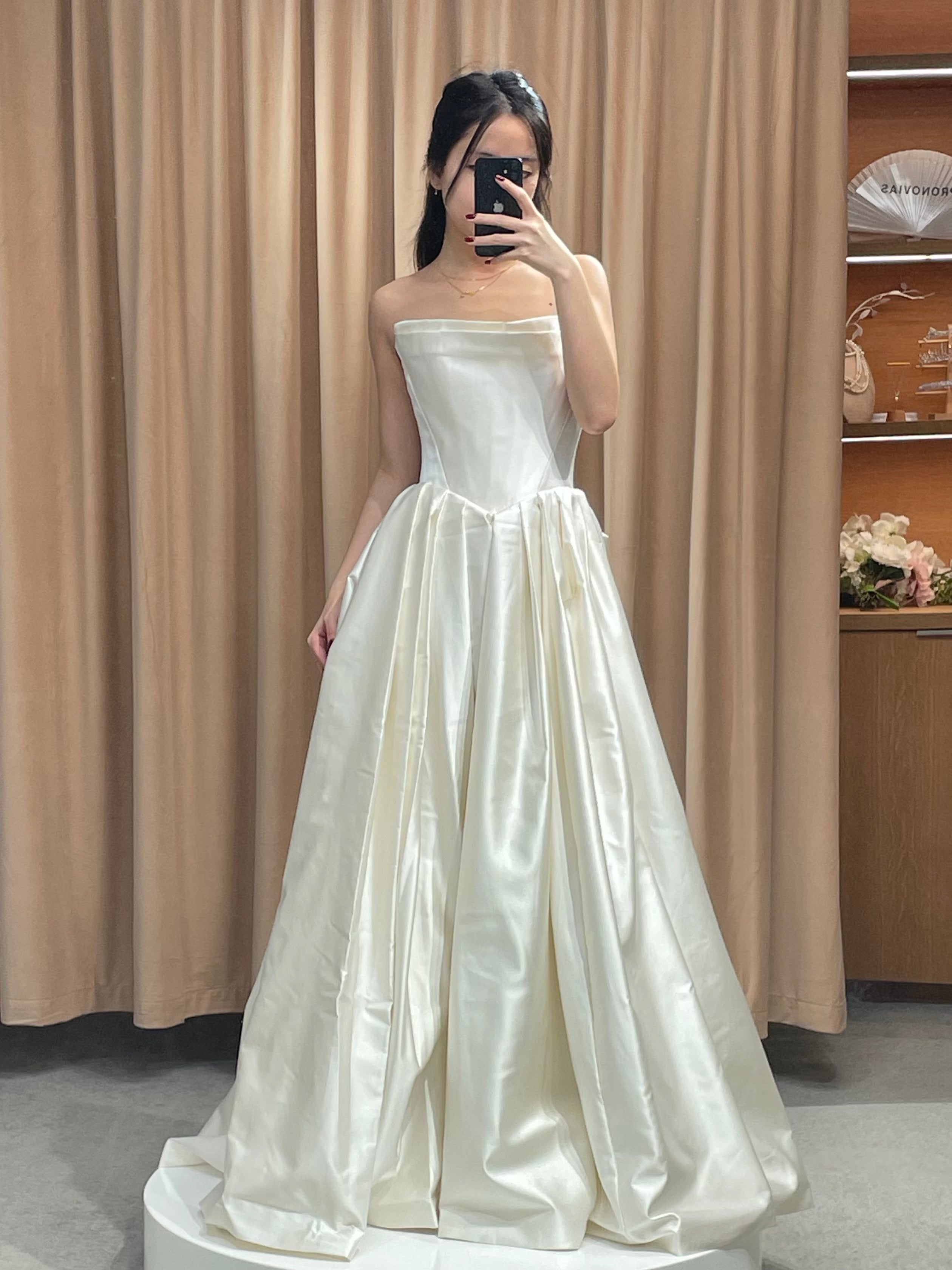 Discover your dream gown, where classic beauty meets contemporary design. This stunning strapless dress is sculpted from the finest satin, cascading into a graceful A-line skirt that moves with you. The delicate sweetheart bodice elegantly frames your collarbone, creating a look that is both feminine and sophisticated. Designed for the bride who believes in timeless style, this gown is a canvas for your love story—ready to be accessorized with a veil for tradition or statement jewelry for a modern twist. Step into a moment of pure, radiant elegance.