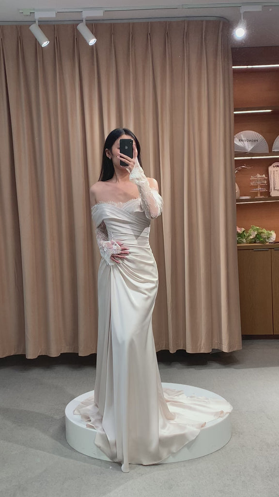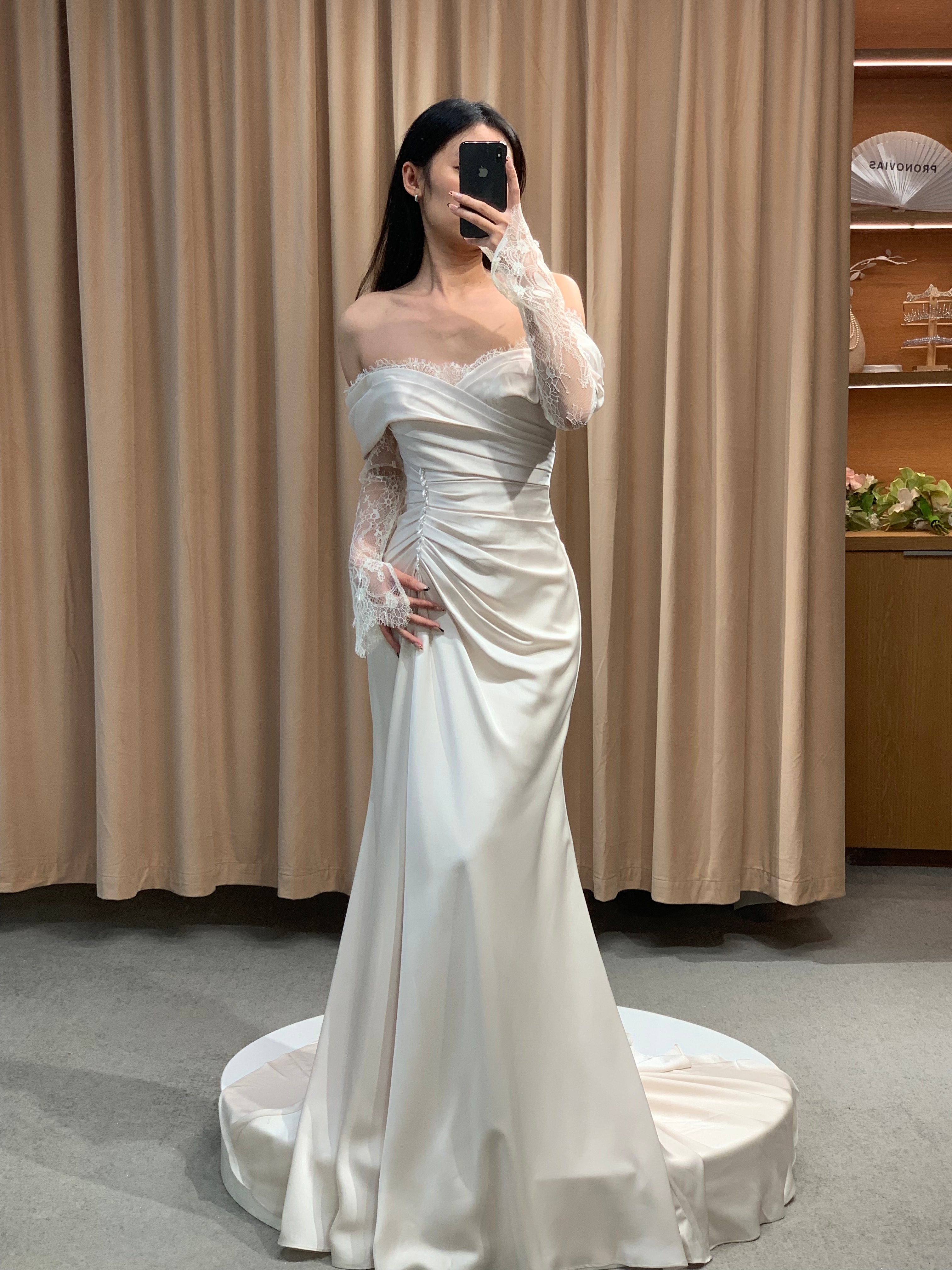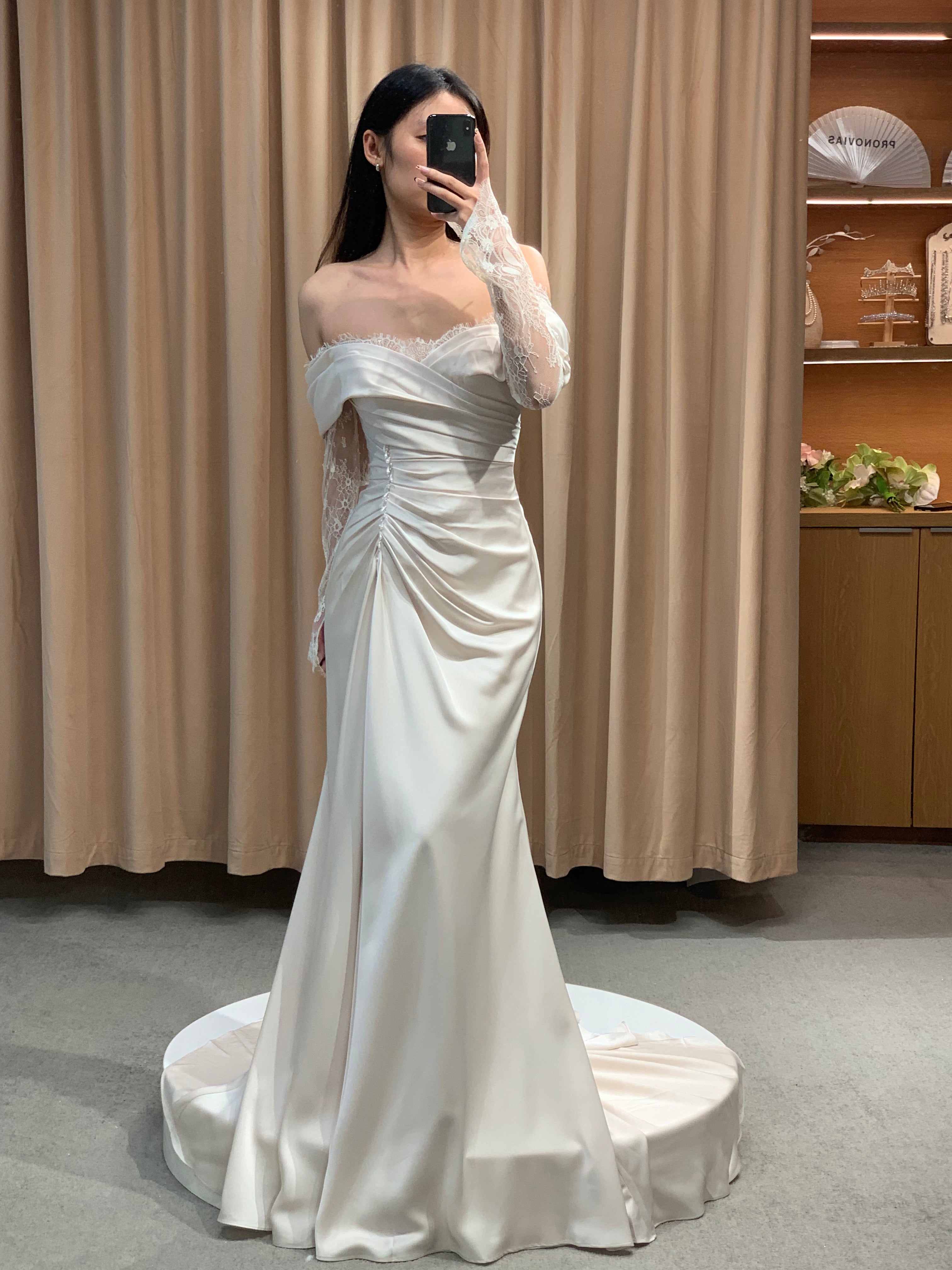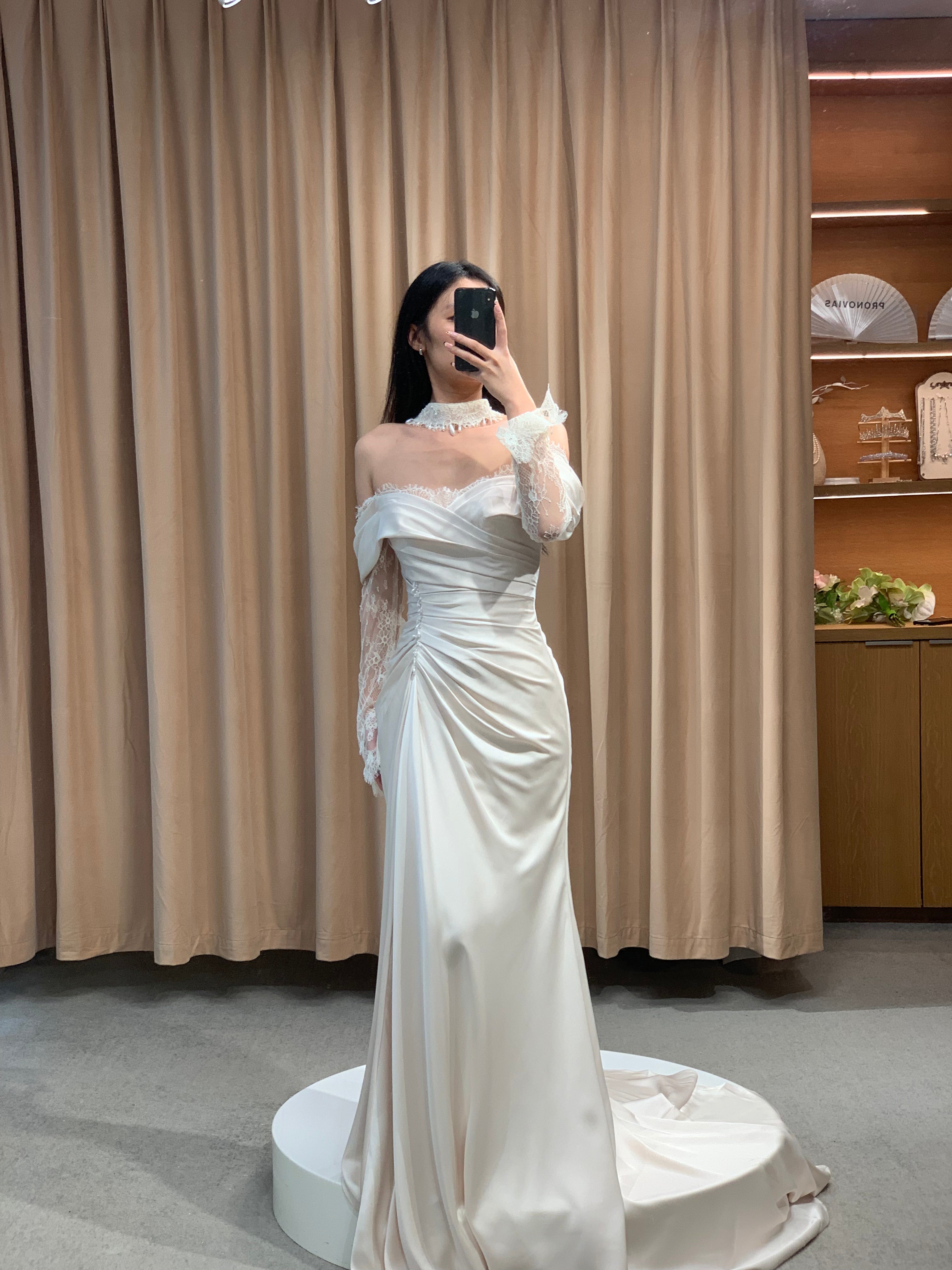 This sophisticated wedding gown combines luxurious satin with delicate lace detailing for a timeless bridal look. The elegant lace sleeves and bodice accents flow into a matching lace choker, creating a beautifully coordinated ensemble. Featuring a sleek column skirt that elegantly drapes the figure, the dress offers a modern silhouette with classic romance. Perfect for the discerning bride, this design blends clean lines with intricate lacework for an effortlessly elegant statement.