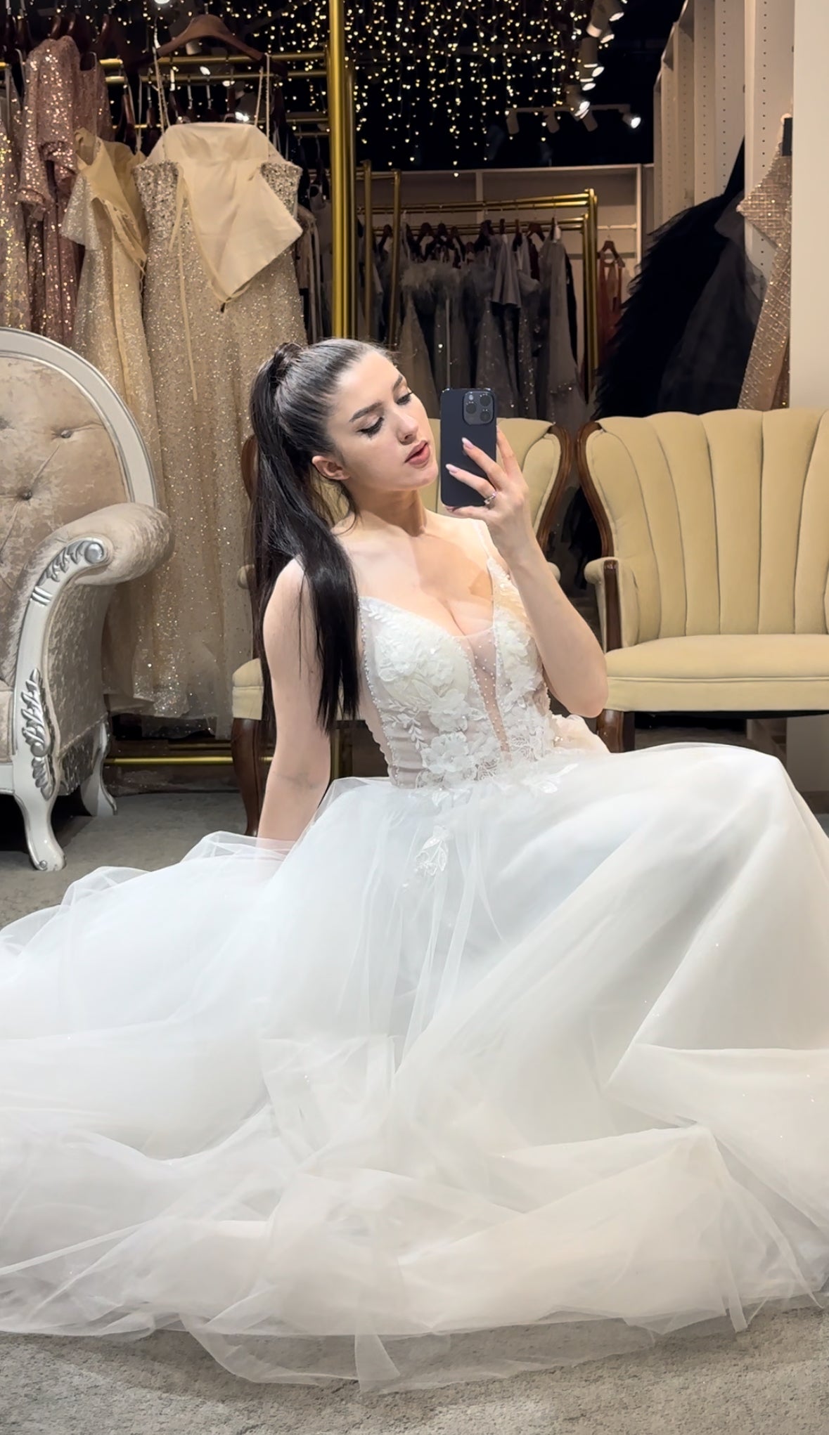 This enchanting wedding dress combines bold elegance with whimsical charm. The deep V-neckline and delicate spaghetti straps create a flattering and feminine silhouette, while the low back adds a touch of allure. The voluminous puffy skirt flows gracefully, giving the gown a fairytale-like quality. Intricate floral embroidery adorns the bodice and cascades onto the skirt, adding texture and romance.