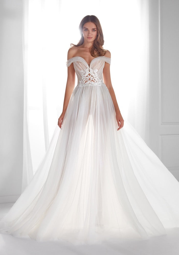 This romantic A-line gown features a sweetheart neckline with an off-shoulder design, exuding timeless charm. The delicate lace detailing along the center of the bodice creates an elegant focal point, flowing seamlessly into a soft and airy tulle skirt.