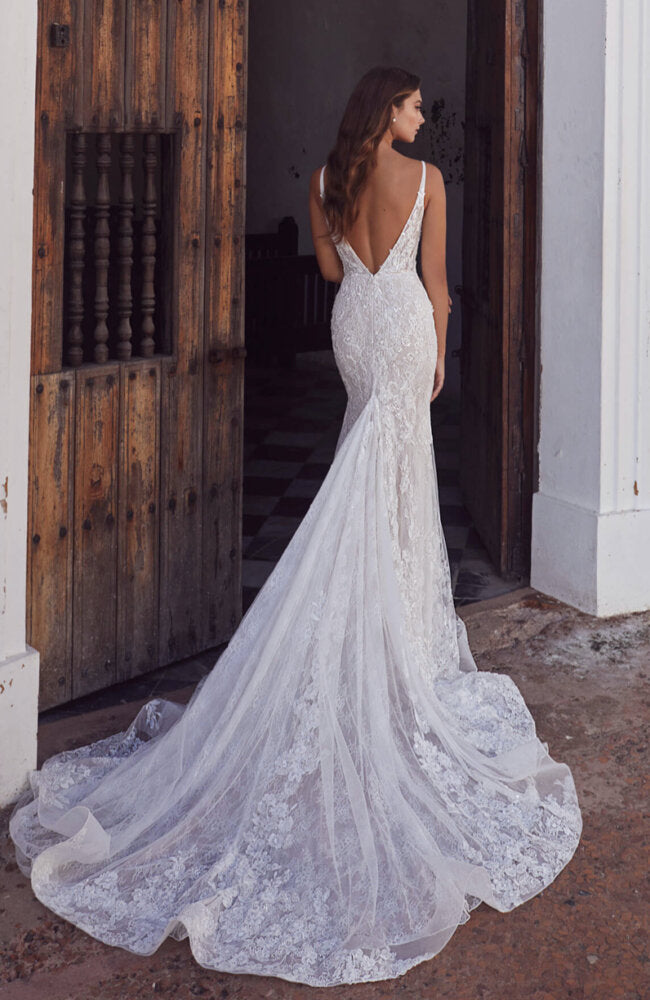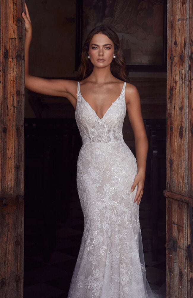 The Amani wedding dress offers a relaxed, fitted silhouette that effortlessly flatters the bride’s figure. Featuring a graceful V neckline and a low V back, this gown is crafted from softly shimmering lace that adds a subtle glow without overwhelming the design. Understated yet undeniably elegant, Amani is a breathtaking choice for the bride seeking timeless beauty with a modern, effortless feel. Its delicate fabric drapes beautifully, creating a romantic and refined look perfect for both intimate ceremonies and grand celebrations.