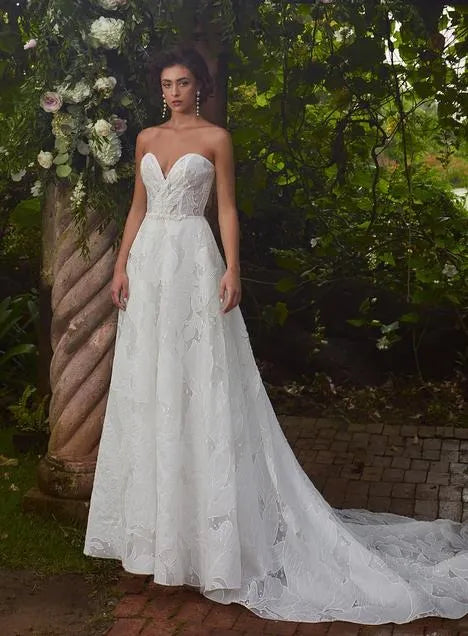 Whimsical and airy, this A-line gown features a soft sweetheart neckline and a ruched bodice that flatters the figure with gentle texture. The flowing skirt is adorned with bold, oversized floral prints, adding a fresh and artistic touch to the romantic silhouette. Light and graceful, this gown is perfect for the bride who wants to make a statement with elegance and ease.