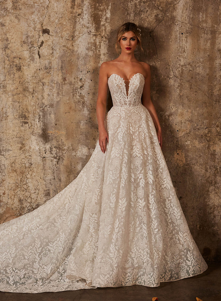 Graceful and effortlessly romantic, the Lara gown is an A-line masterpiece designed for the bride who loves timeless simplicity. Featuring a soft sweetheart neckline and a flowing A-line silhouette, this dress is crafted entirely from delicate lace, offering texture and elegance without the need for sparkle. With its understated beauty and classic charm, Lara is perfect for brides seeking a refined and graceful look on their wedding day.
