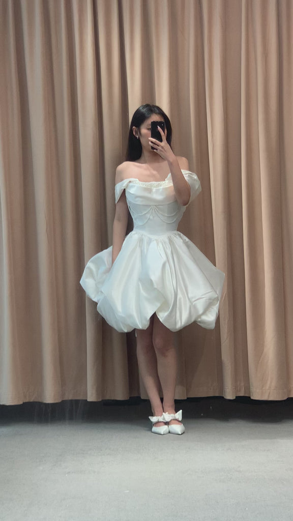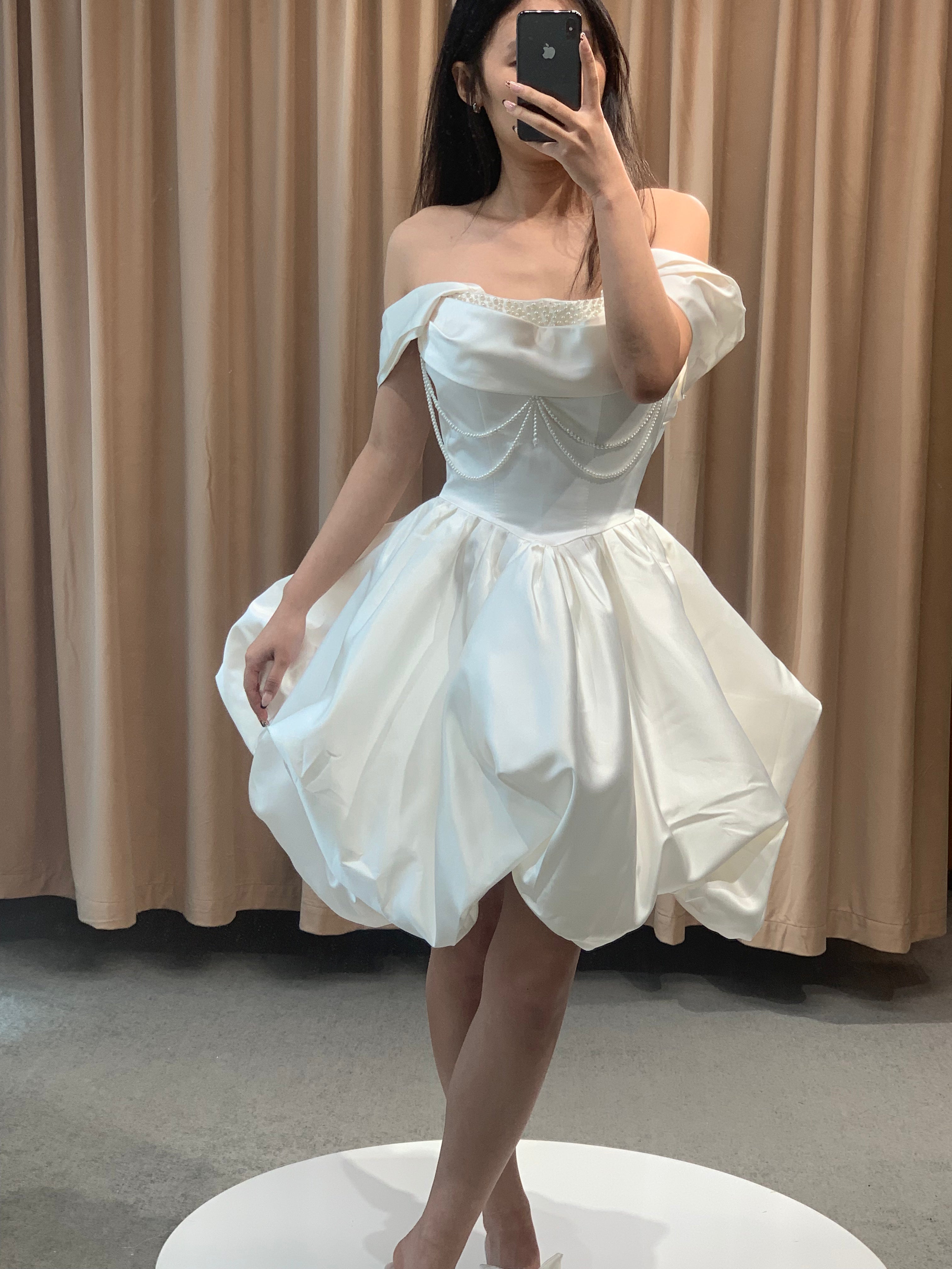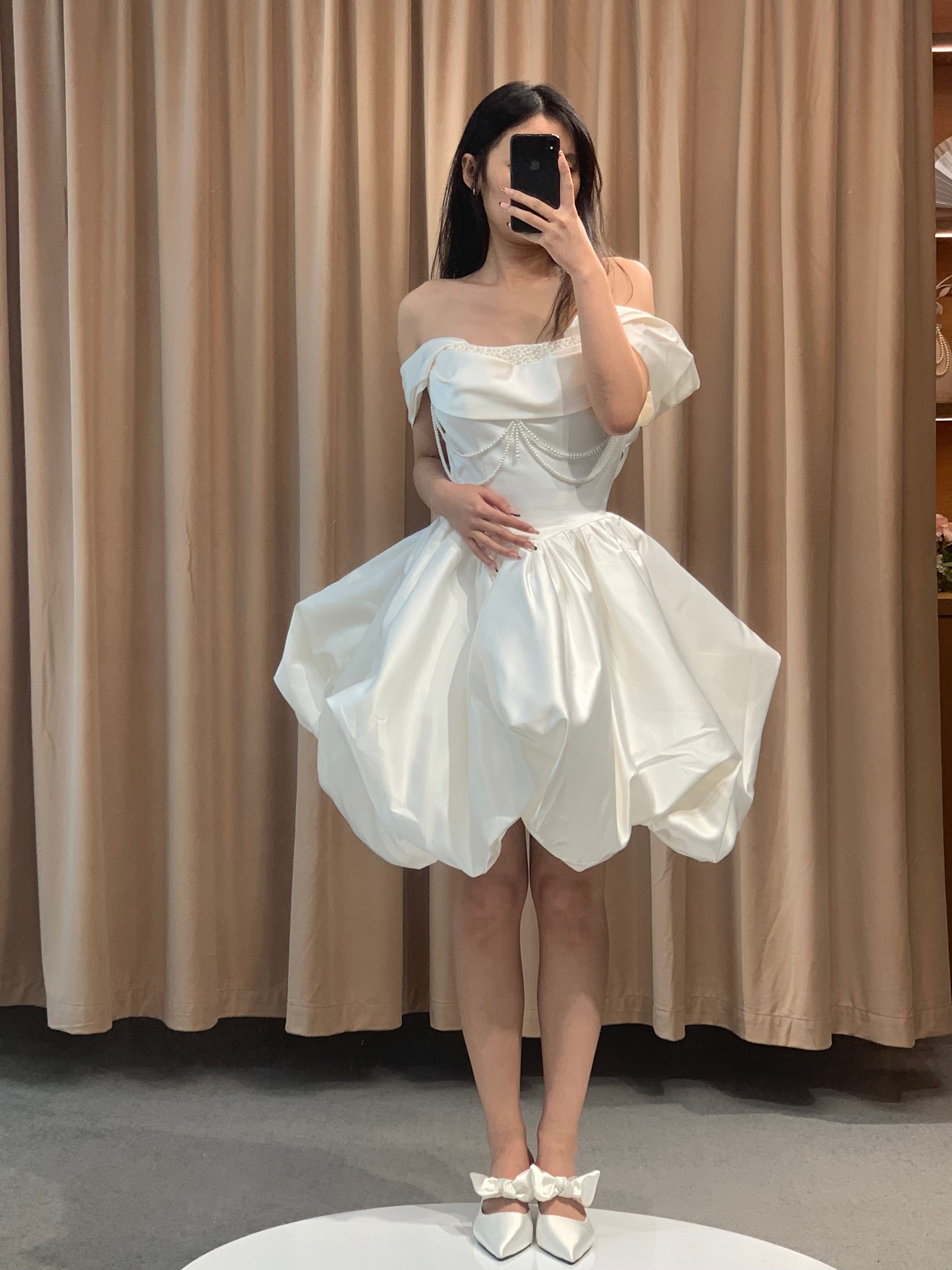 This chic short wedding dress presents a sophisticated tulip skirt design, crafted from luxurious satin. The bodice is elegantly adorned with delicate pearl embellishments for a timeless touch. A graceful lace-up back adds a romantic and adjustable fit to the silhouette. Perfect for the modern bride, this gown beautifully blends contemporary style with classic elegance.
