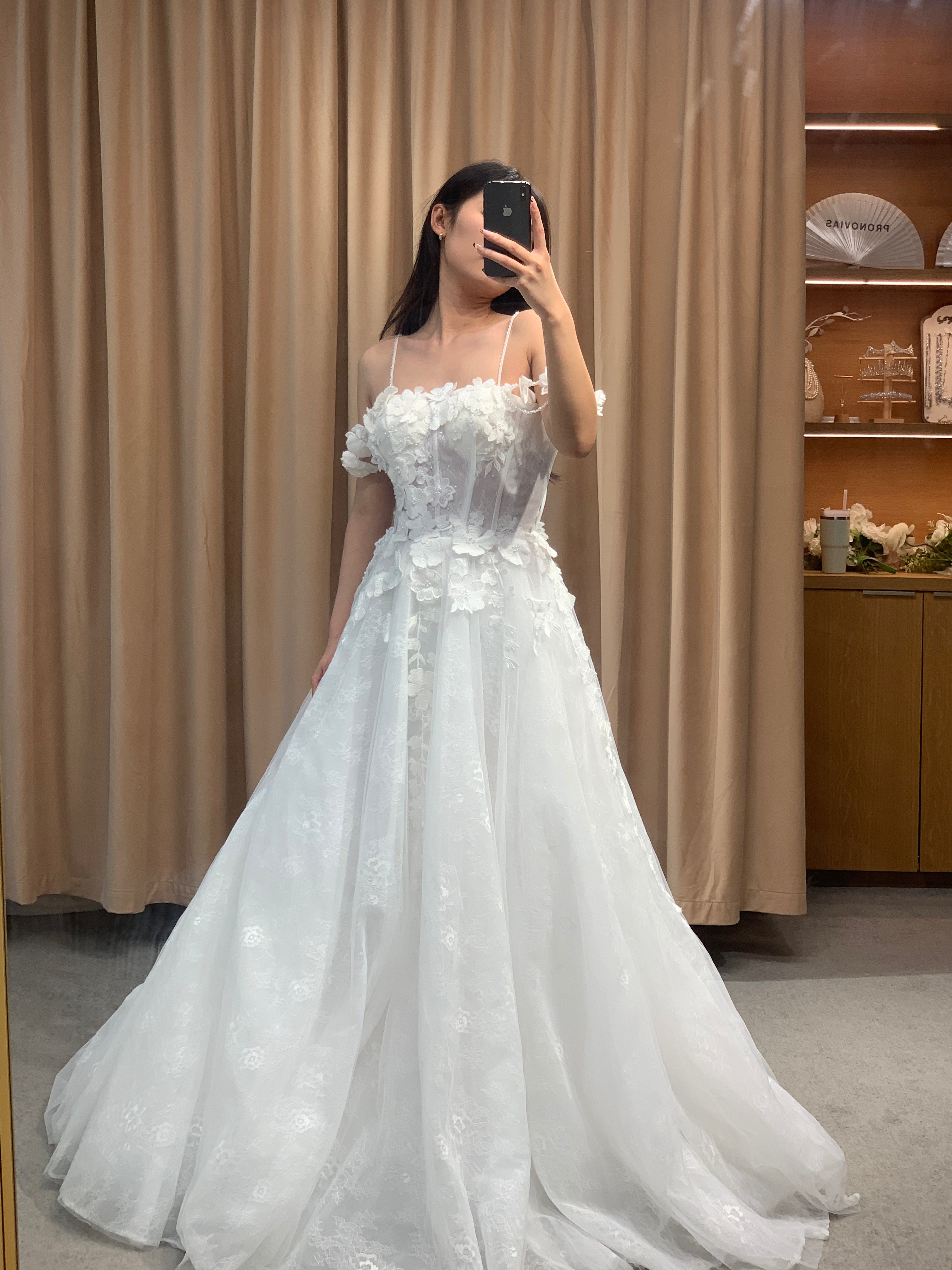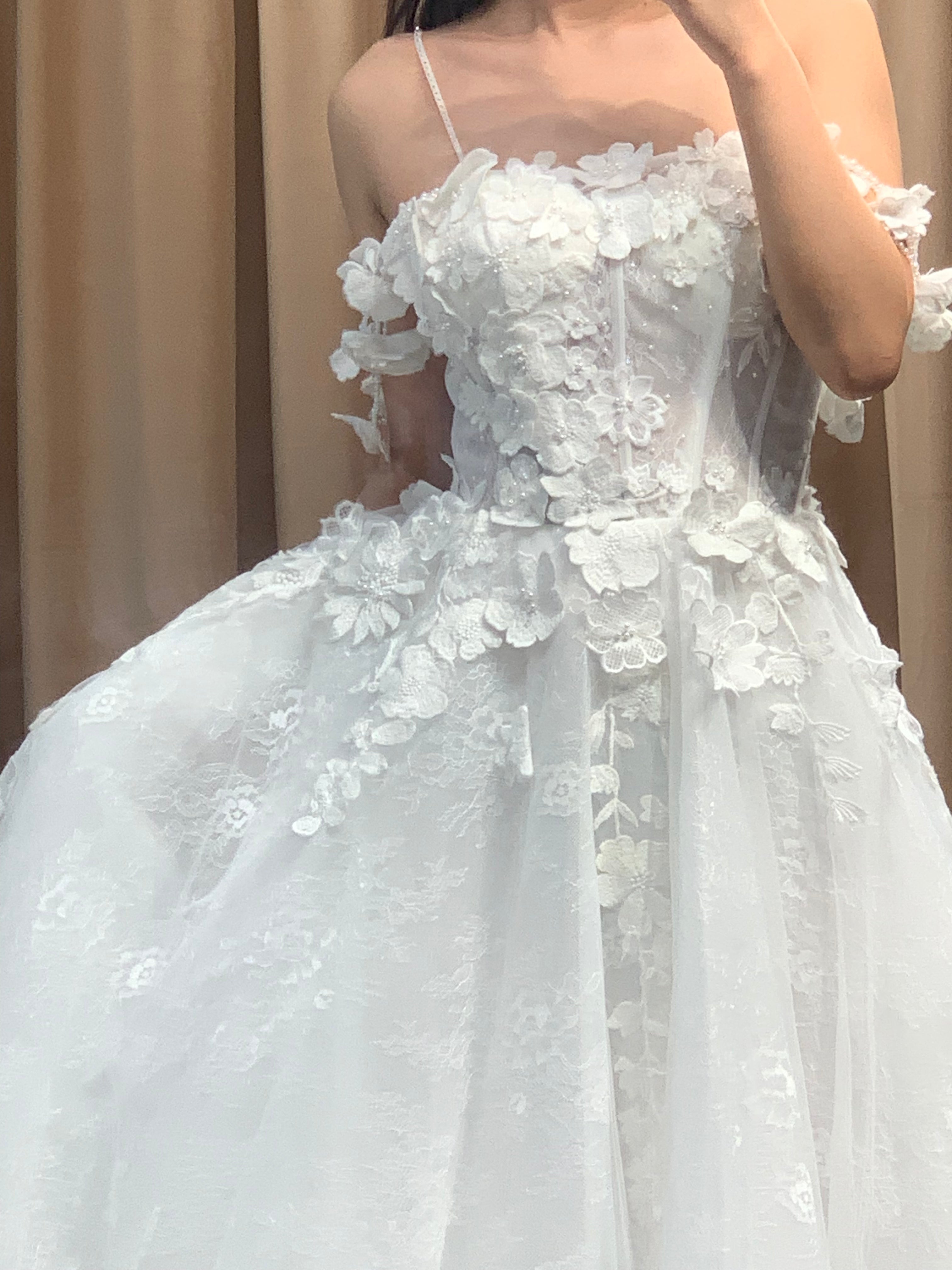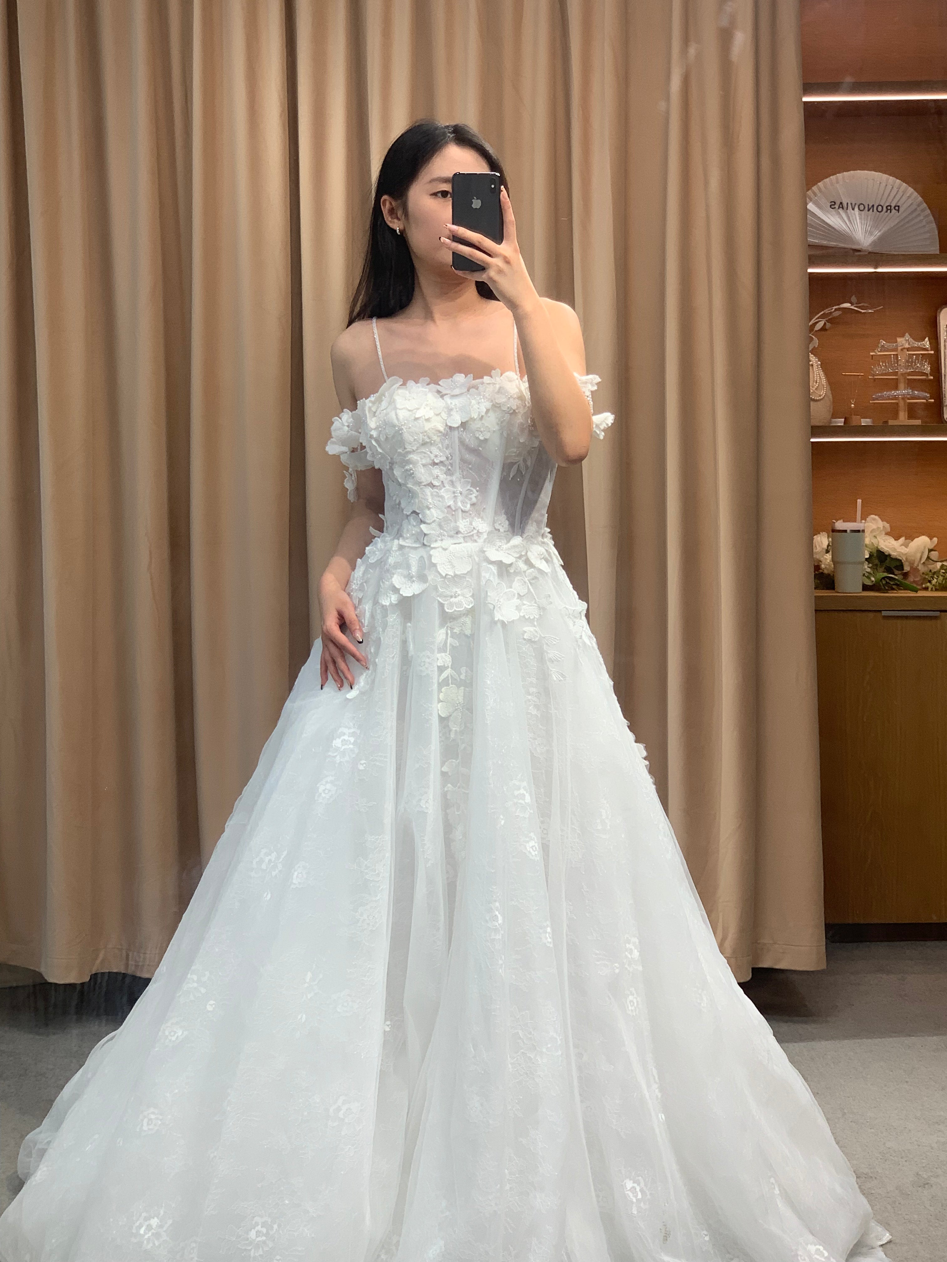 Step into a storybook moment with this breathtakingly romantic gown. Designed for a modern princess, it features a unique dual-strap detail—spaghetti straps secure a graceful off-the-shoulder neckline that elegantly frames the collarbone. The expansive tulle skirt becomes a canvas for nature's art, scattered with meticulously crafted 3D floral appliqués that add depth and fantasy. Every detail, from the structured yet airy bodice to the voluminous skirt, is designed to make you feel as if you've stepped right out of a enchanting fairytale.