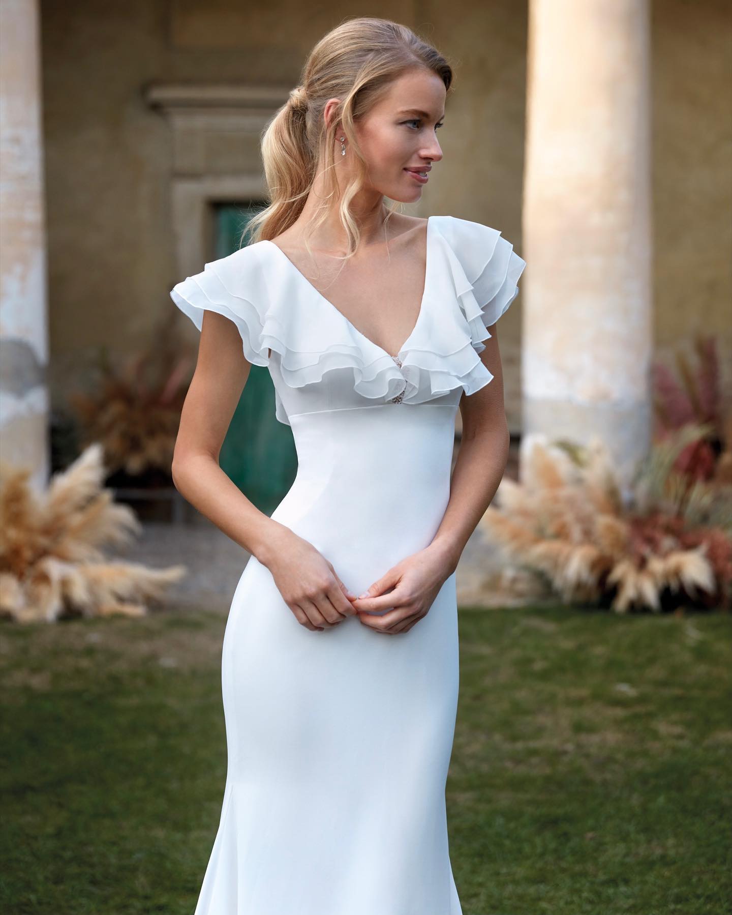 This classic mermaid gown features a refined V-neckline and delicate cap sleeves, offering a timeless and elegant design. The clean, minimalist silhouette enhances the figure with understated sophistication.