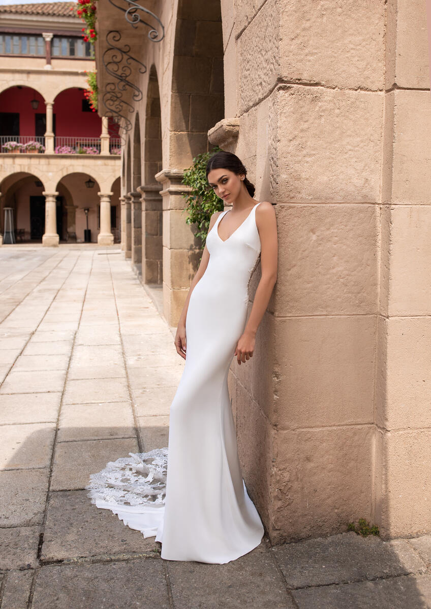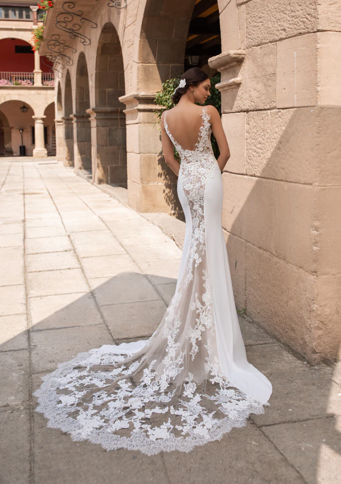 This sophisticated mermaid gown combines modern minimalism with intricate detail. The front features a sleek crepe fabric and a plunging V-neckline, offering a clean and elegant look. The back reveals exquisite lacework, creating a stunning contrast and making the dress uniquely captivating.