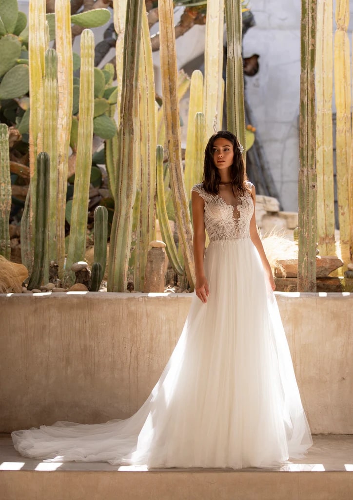 This enchanting A-line wedding gown features a delicate V-neckline and intricate lace appliqués, exuding timeless elegance. The flowing tulle skirt adds a touch of ethereal beauty, while the open back enhances its romantic allure.