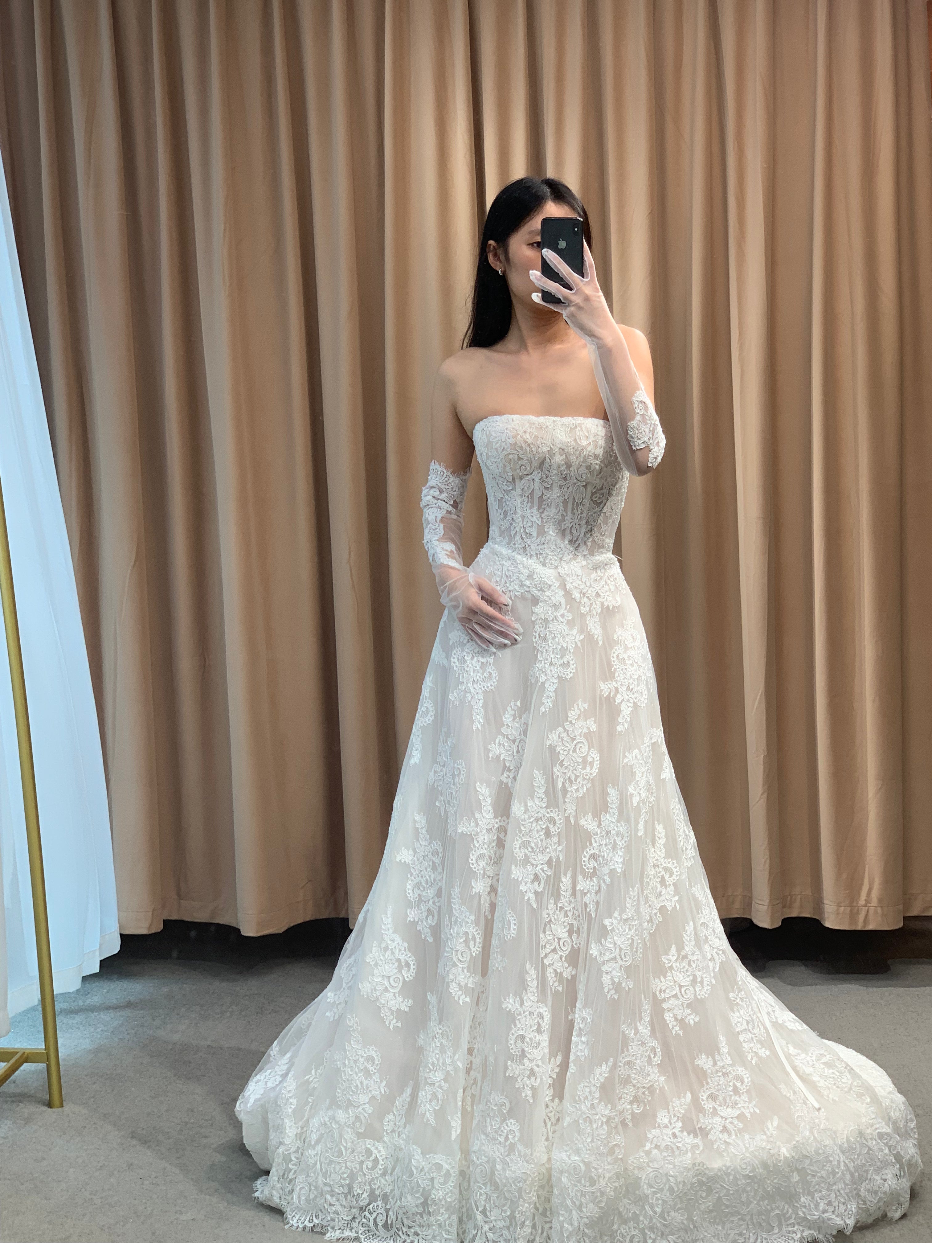 This exquisite wedding gown features a sophisticated straight-neckline bodice crafted entirely in delicate lace with a vintage-inspired pattern. Designed with timeless elegance, the dress includes a pair of detachable lace gloves that complete the romantic, retro aesthetic. The intricate lace detailing flows seamlessly throughout the silhouette, creating a cohesive and enchanting bridal look. Perfect for the bride seeking a touch of classic romance, this ensemble offers both elegance and versatility for your special day.