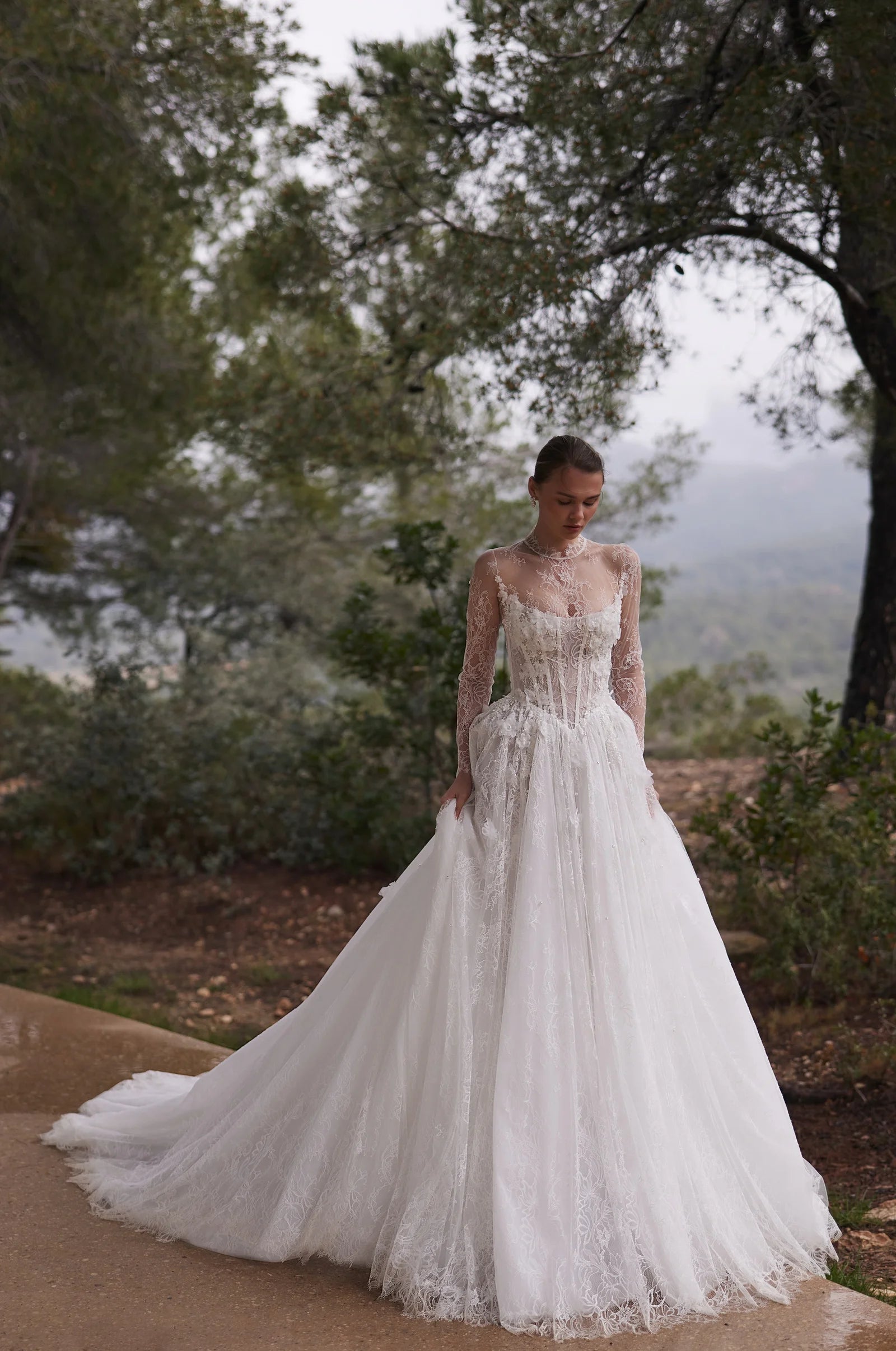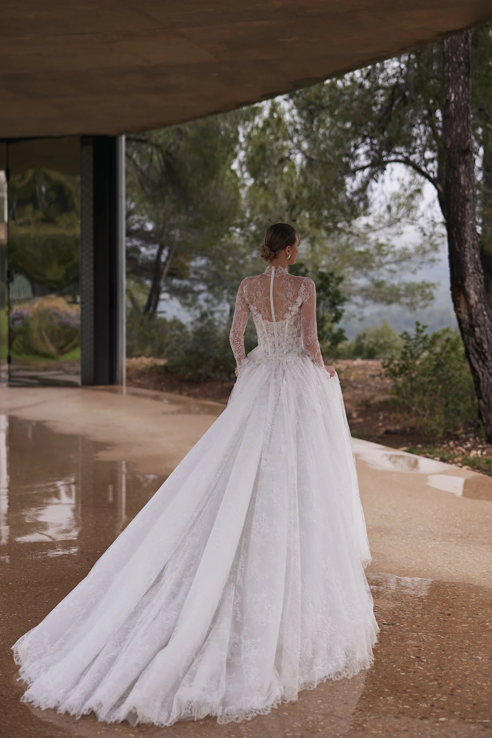 A semi-sheer lace gown featuring a structured corset bodice and a high neckline. Designed in a flattering A-line silhouette, it fastens at the back with a discreet zipper. Delicate 3D floral appliqués adorn the bodice and flow onto the skirt, adding soft dimension.