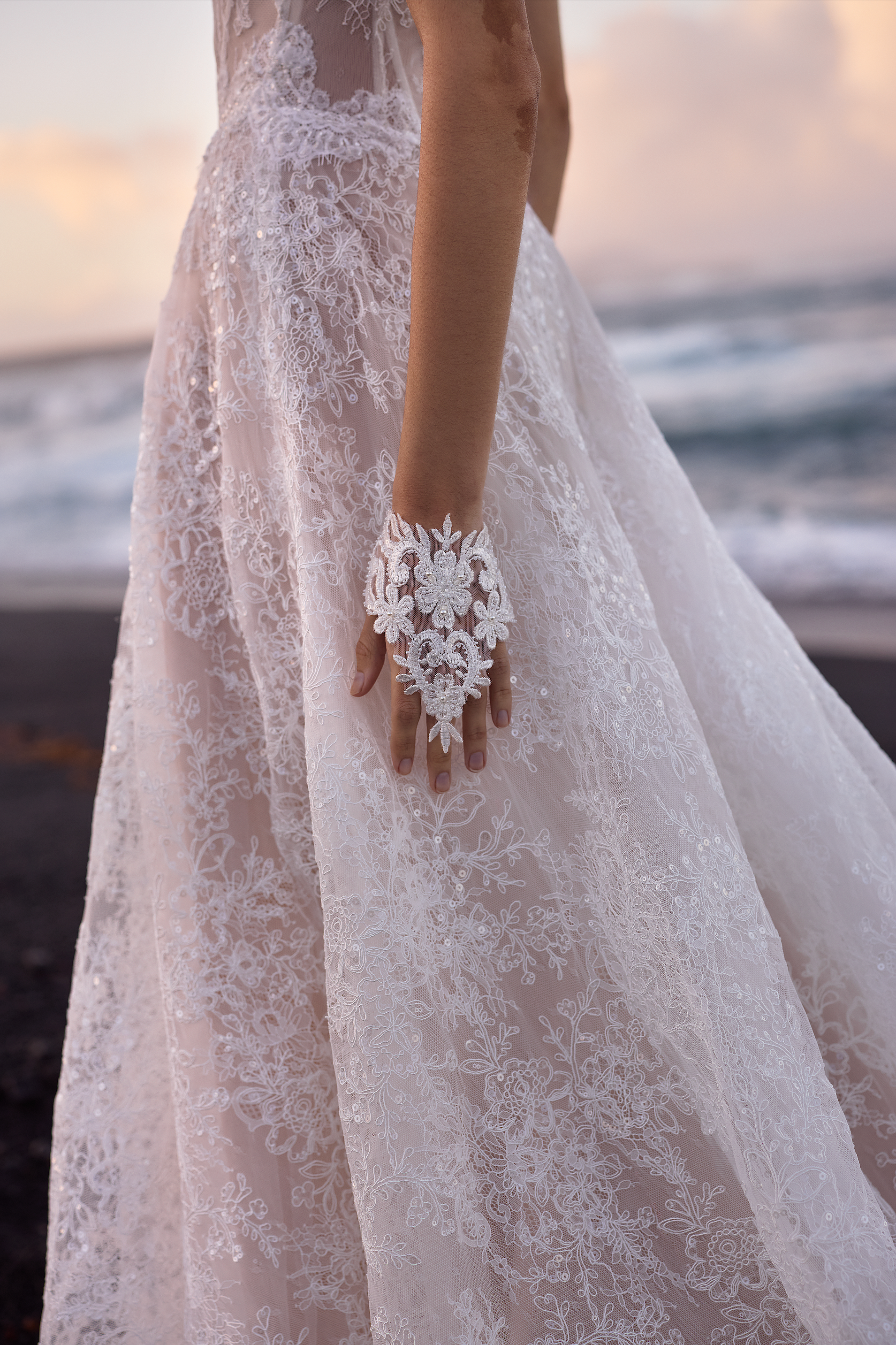 Romantic A-line wedding gown crafted from delicate lace with intricate floral detailing and sparkling all-over sequins. Featuring a boned drop-waist semi-sheer lace corset that flatters the figure, a heart-shaped neckline with subtle V-cut and detachable cups, embellished spaghetti straps, and a closed back with a zip closure. The maxi skirt, made from layers of lace with a nude underskirt, flows gracefully into a midi train, adding an ethereal finish. The gown can be elevated with an Opal fingerless gloves.