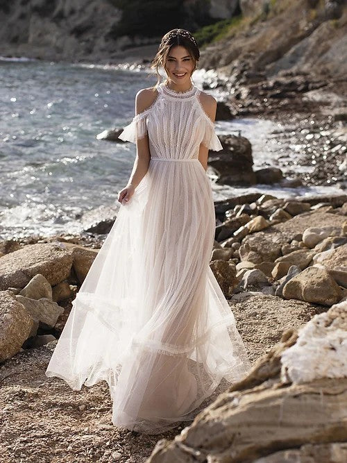 This dress features a halter-neck design with off-shoulder details, complemented by a flowing skirt that adds a touch of movement and elegance. The soft, billowing fabric and unique neckline create a perfect blend of grace and ease, the unique design of this dress is sure to captivate attention and leave a lasting impression.