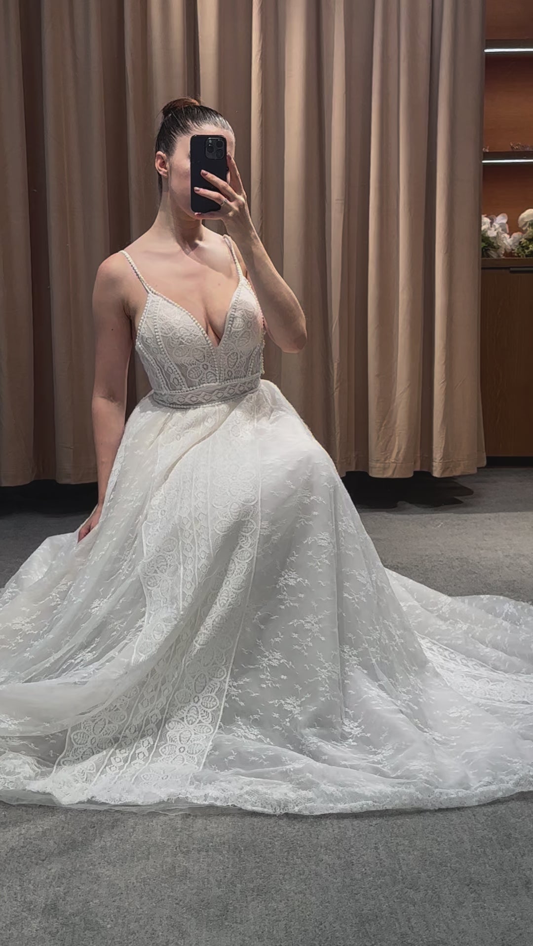 Step into a space designed for comfort and luxury. Our fitting rooms offer soft, cozy seating areas for you and your guests, along with an assortment of shoes to complement your dresses. Our curtains curate a private and safe environment, while our luxurious carpet and lighting ensure you feel pampered as you search for your dream gown. Book your appointment today and visit us to create a truly unforgettable experience.