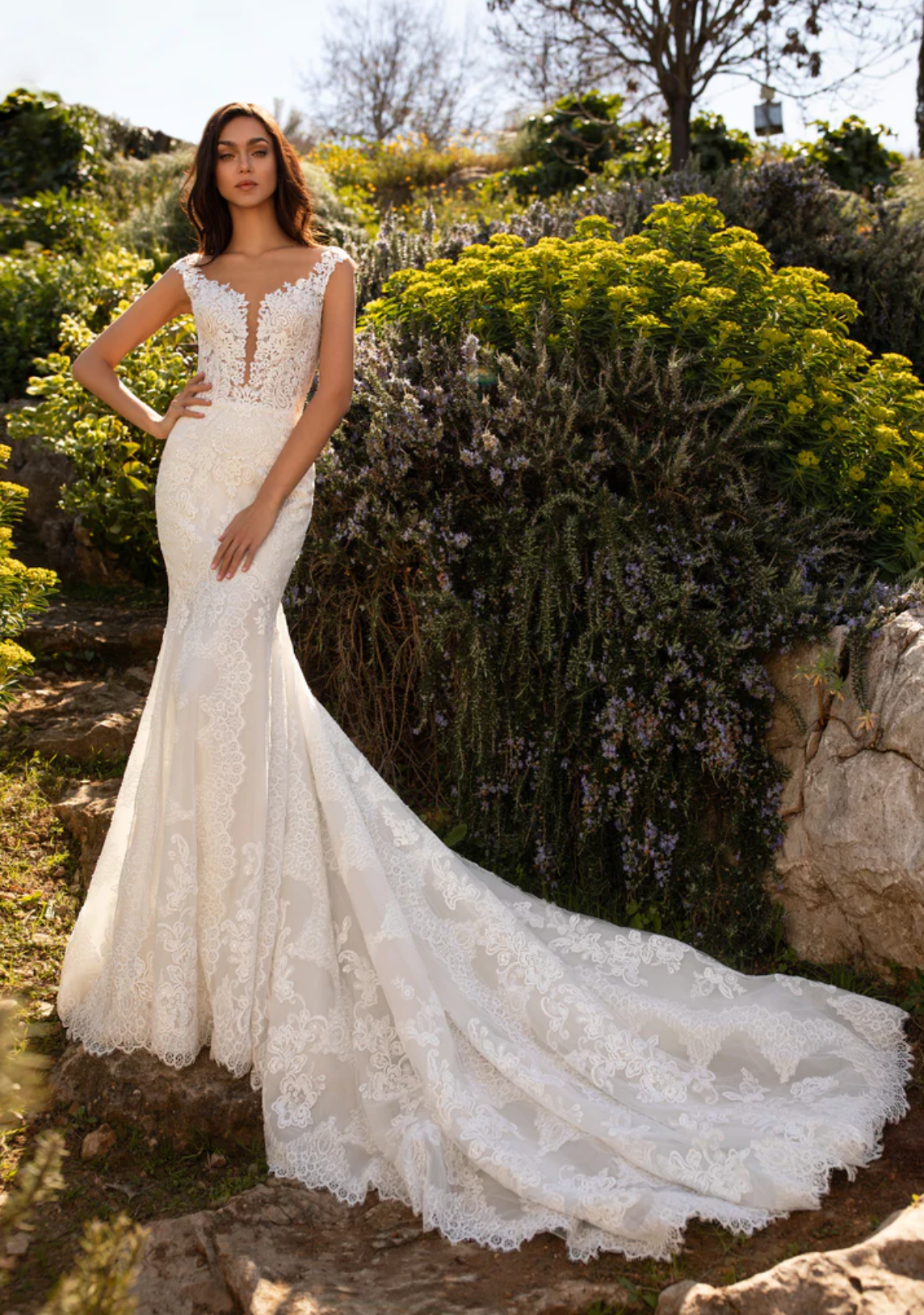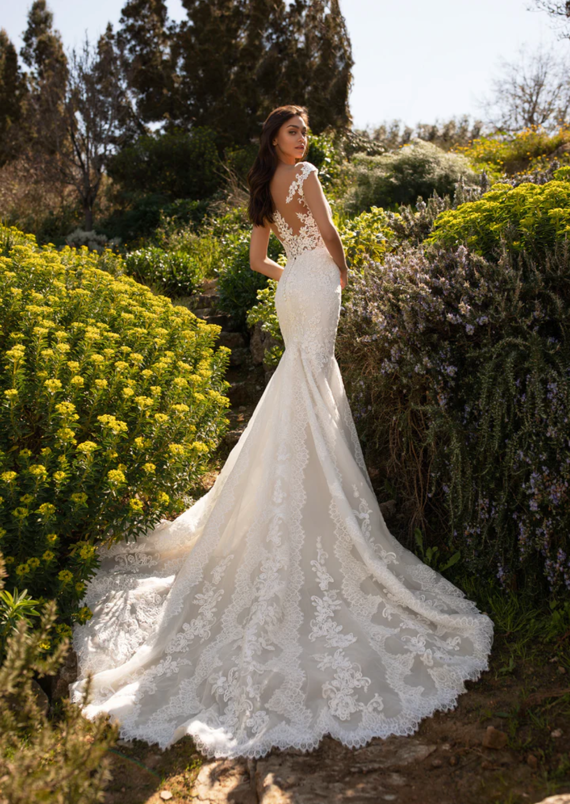 This enchanting mermaid gown showcases a delicate V-neckline and charming cap sleeves, perfectly balancing elegance and romance. Intricate lace appliqués adorn the entire silhouette, creating a timelessly detailed look. The back features a stunning lace design, adding an artistic touch to the gown’s sophisticated allure.